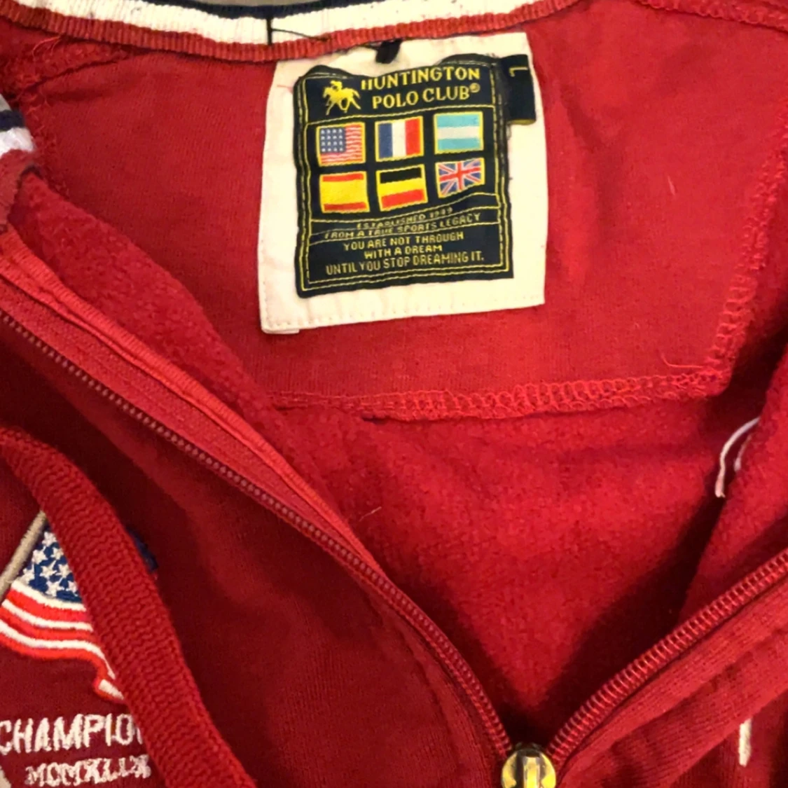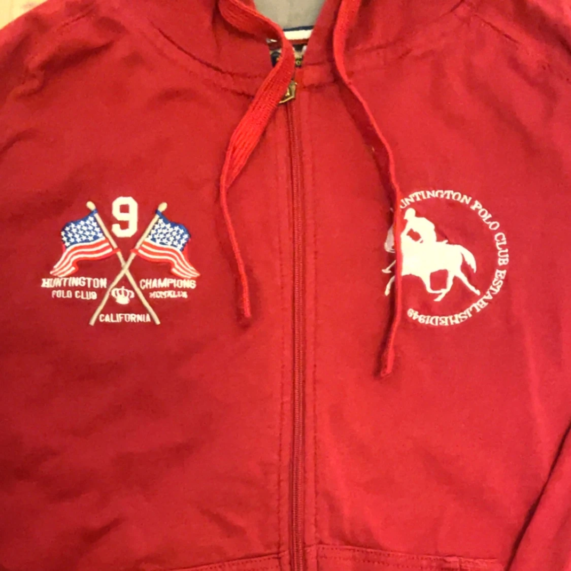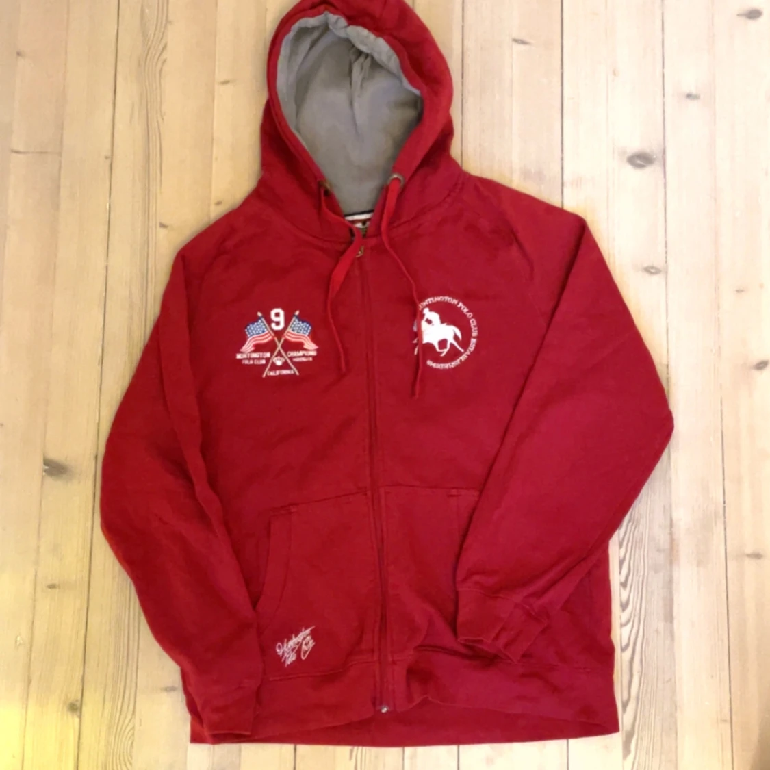 Säljer en röd hoodie från Huntington Polo Club med dragkedja och tryck på bröstet. Den har en justerbar huva och två fickor framtill. Perfekt för en avslappnad stil.