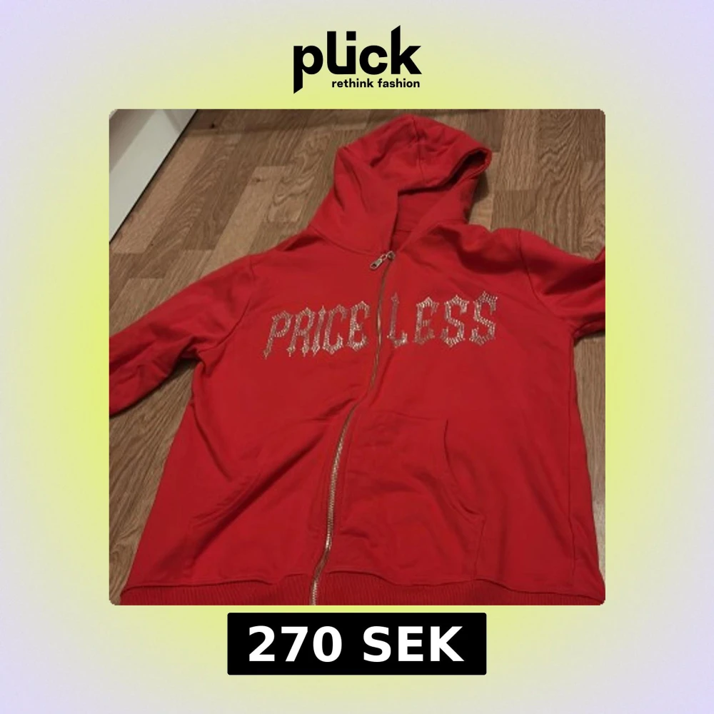 Röd hoodie med huva och dragkedja framtill. Texten 'PRICELESS' i glittriga stenar på bröstet. Mjuk bomullskänsla och två fickor framtill. Perfekt för en avslappnad stil.
