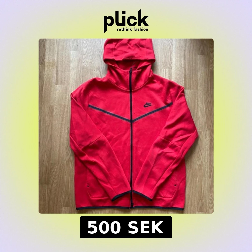 Nike tech fleece hoodiejacka i rött med svarta detaljer och hel dragkedja. Jackan har huva, svarta linjer över bröstet och en praktisk ficka med dragkedja på ärmen. Knappt använd!
