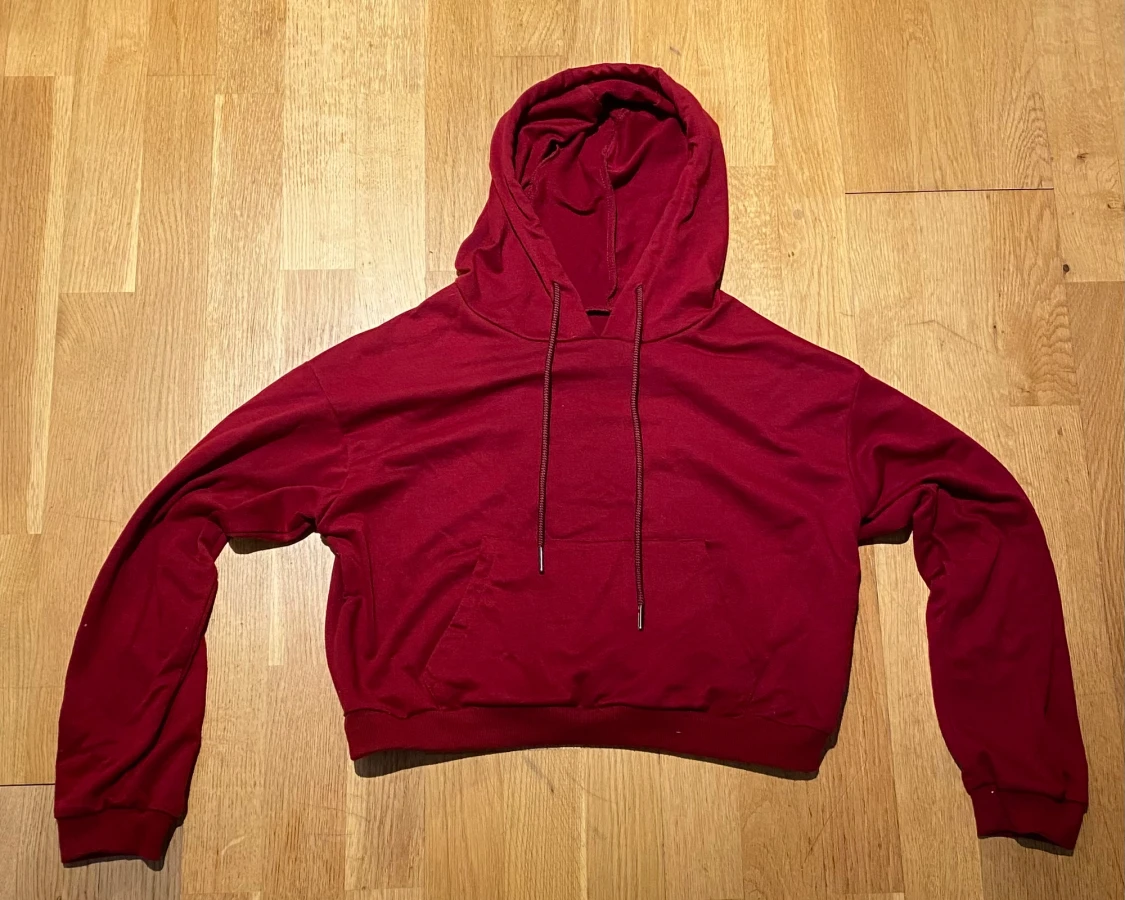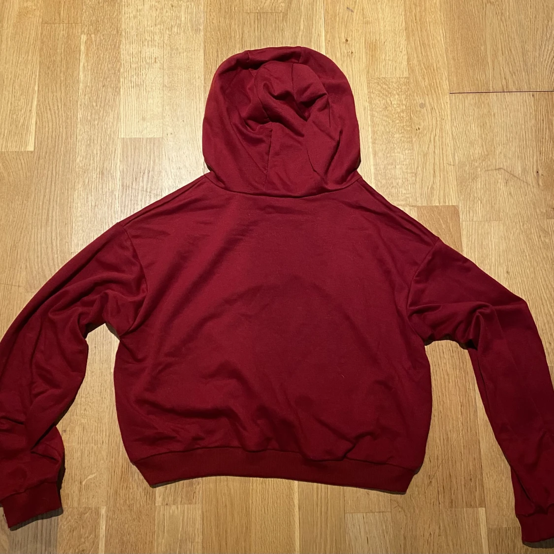 Röd hoodie som är tunn men ändå värmer på vintern.