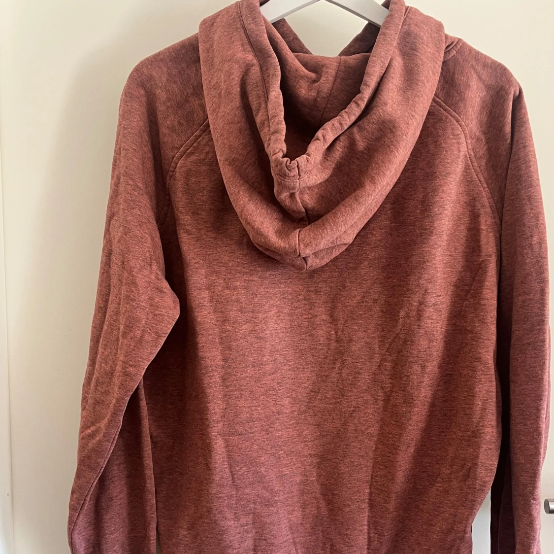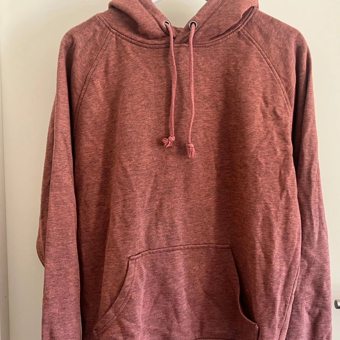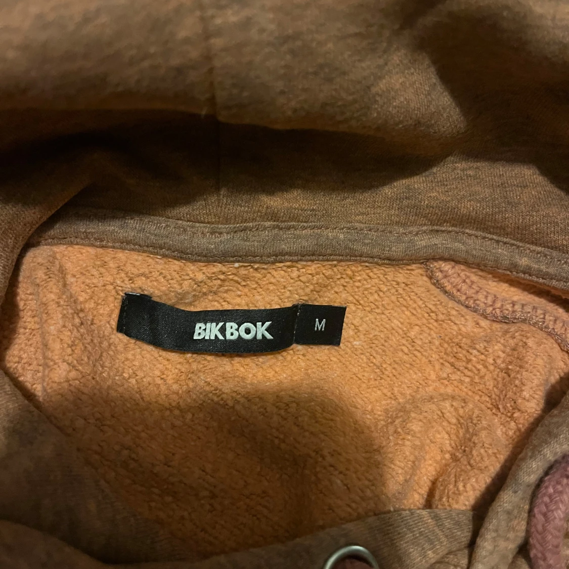 Hoodie från Bik Bok i en dämpad rosa nyans. Tröjan har huva med snörning, känguruficka framtill och långa ärmar.