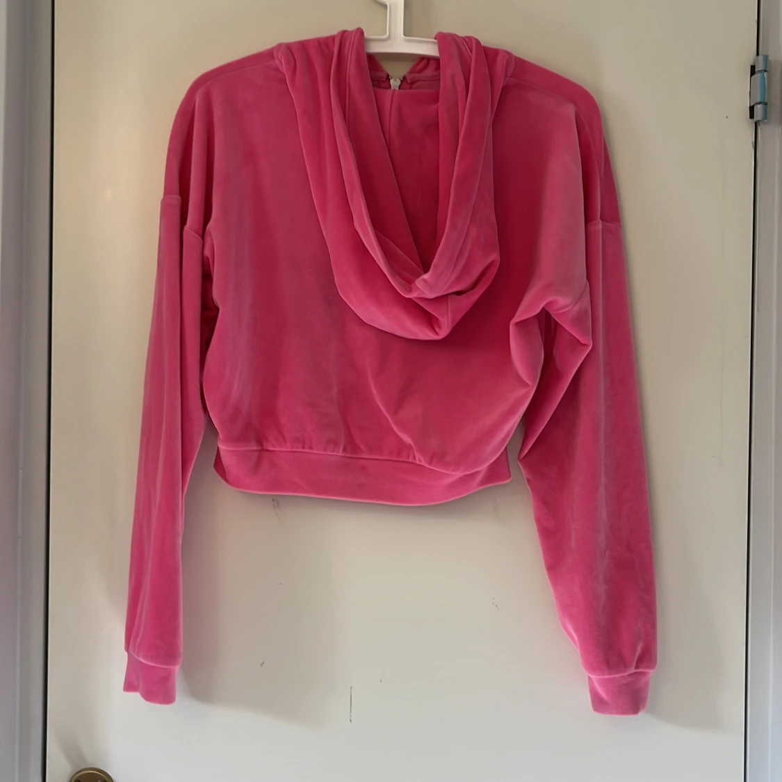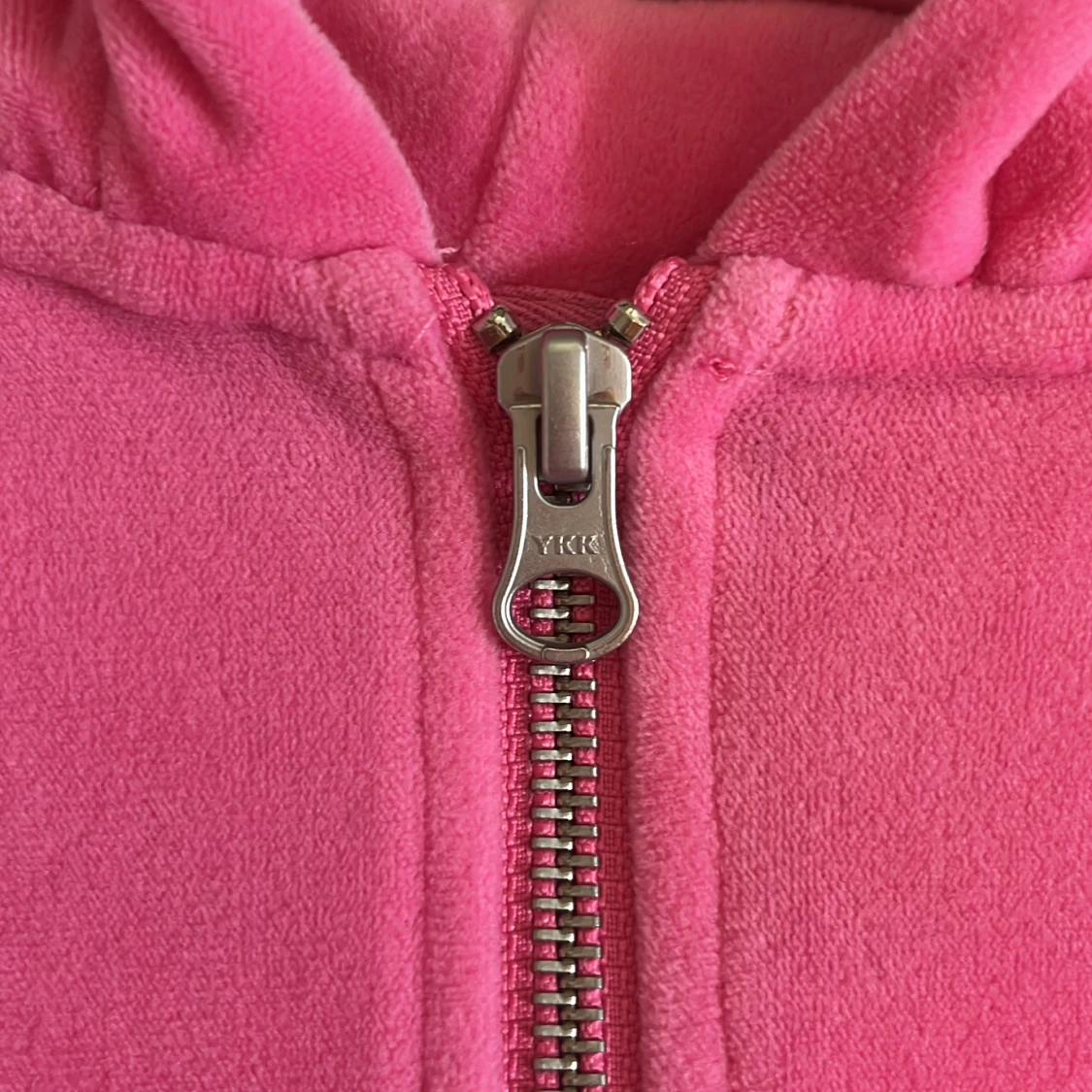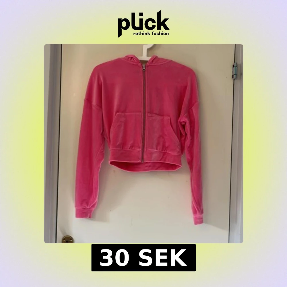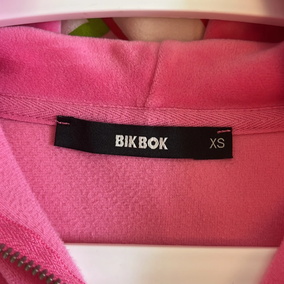 Säljer en rosa hoodie i mjuk velour från Bik Bok. Jackan har dragkedja framtill, huva och två stora fickor. Perfekt för dig som gillar en chill och trendig look. Modellen är lite croppad och har långa ärmar.