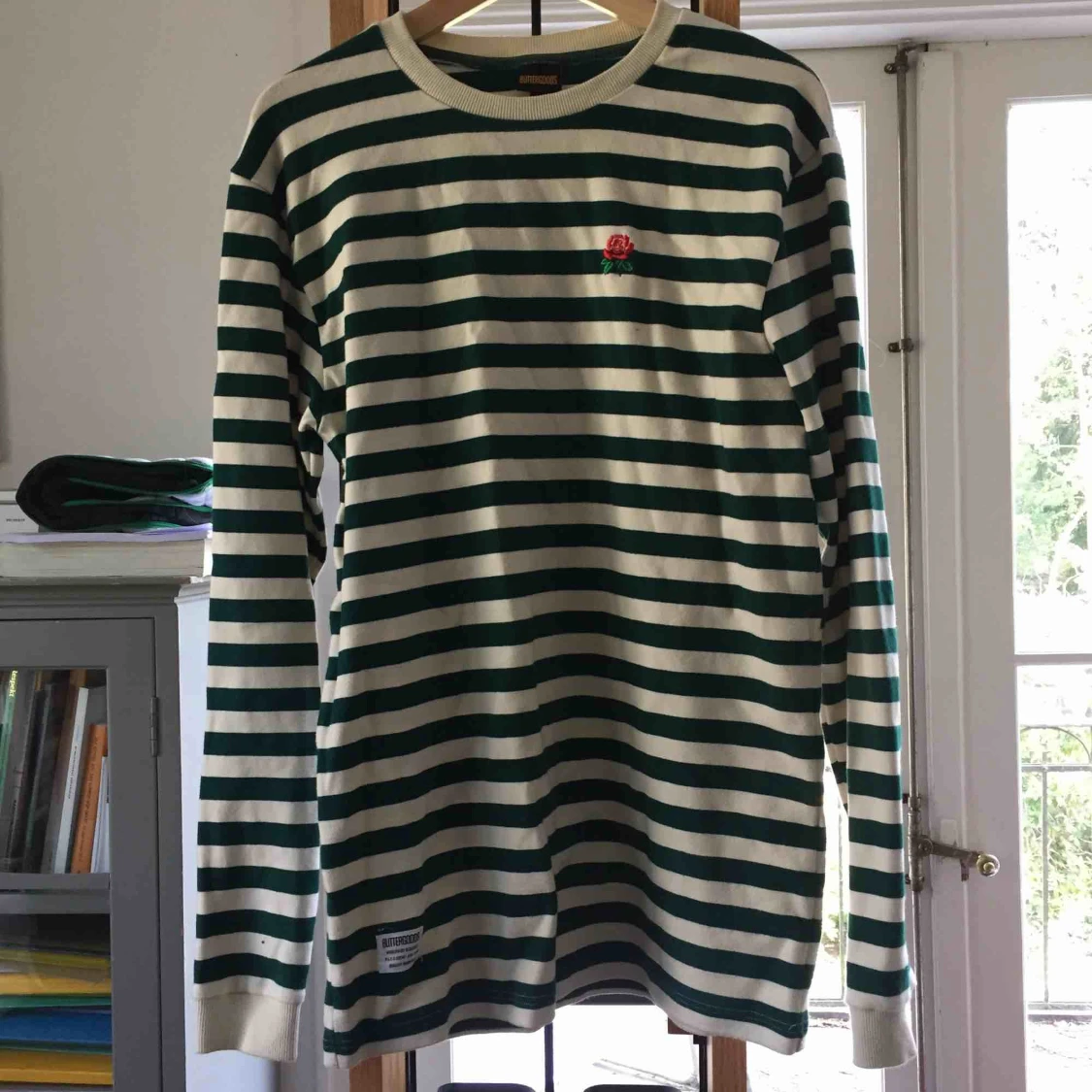 Buttergoods sweater, nyskick. Grön och vitrandiga med märkets ros på bröstet. Bra kvalité och mycket dyrare nypris, svår att hitta i Sverige.