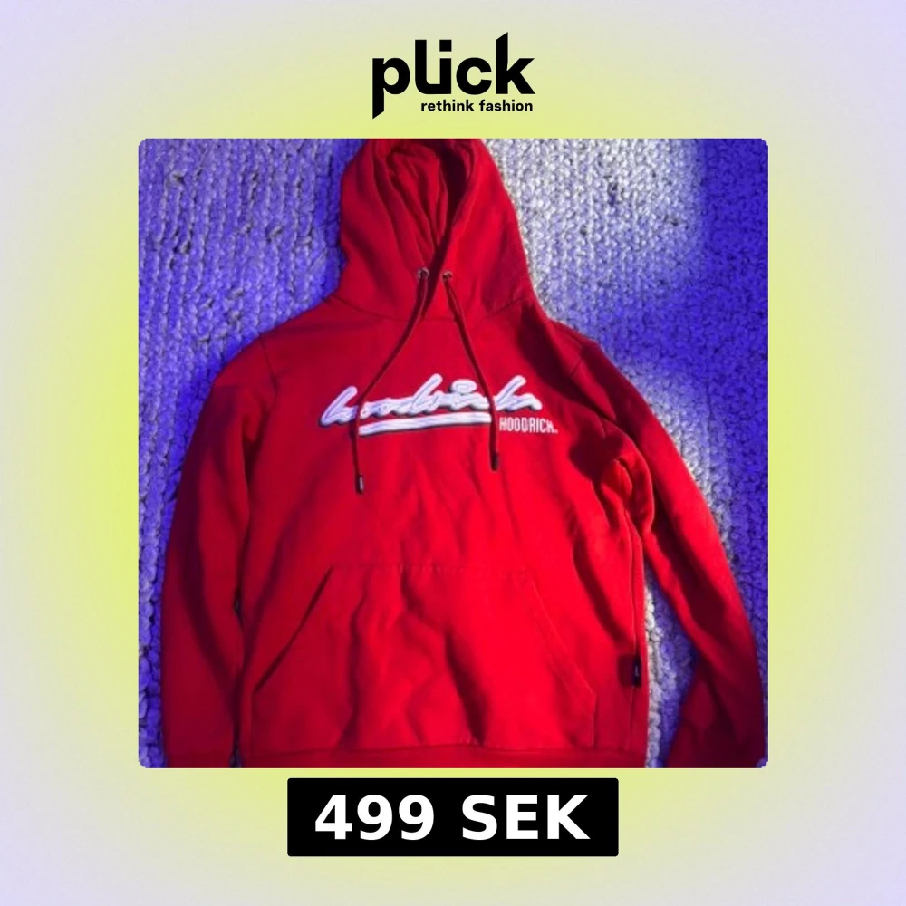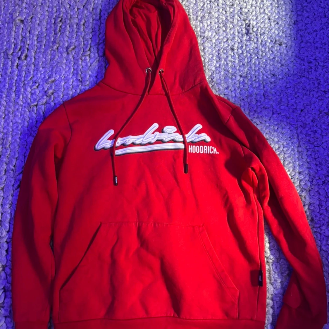 Säljer ett rött Hoodrich set med hoodie och matchande byxor. Hoodien har stor magficka, snörning i huvan och vit logga framtill. Byxorna har resår i midjan, snörning och vit Hoodrich-logga längs benet. Perfekt för chill dagar eller streetwear vibes.