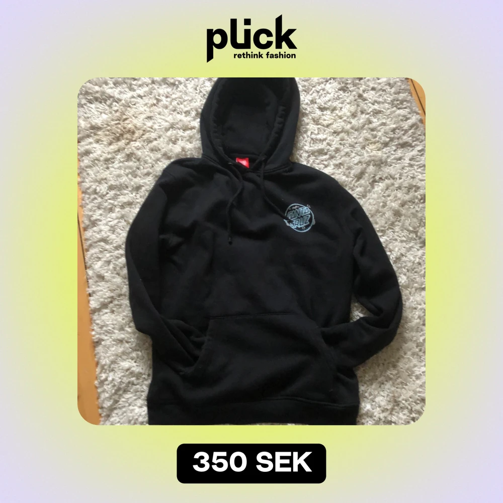 Säljer en svart hoodie från Santa Cruz i storlek S. Den har en cool grafisk design med ett färgglatt tryck på bröstet. Perfekt för höst och vinter, med en skön passform och känguruficka framtill. Huvan har dragsko för justering. Perfekt för streetwear-stilen!