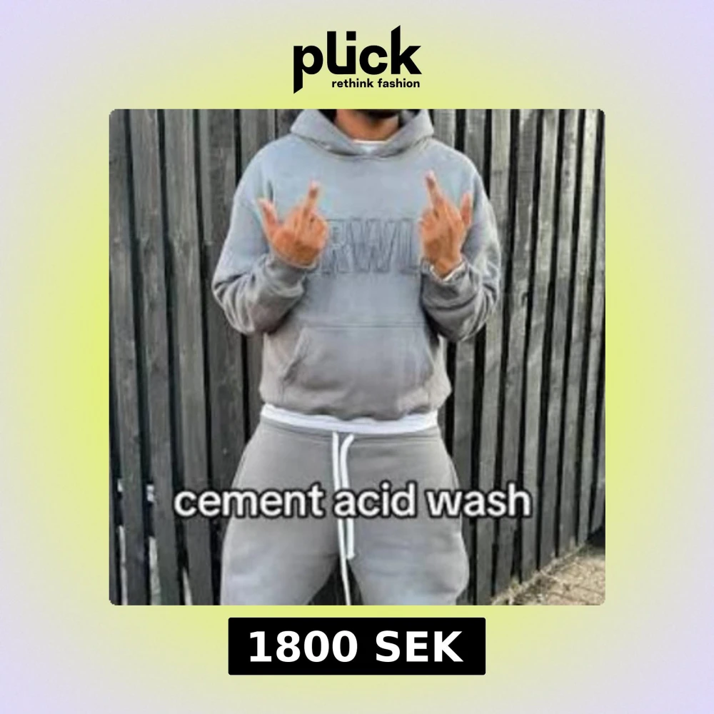 Säljer en grå hoodie från RWL med cement acid wash-effekt. Hoodien har en stor huva och ribbade muddar vid ärmar och midja. Broderad logga framtill i samma ton för en clean look. Perfekt för dig som gillar streetwear vibes.