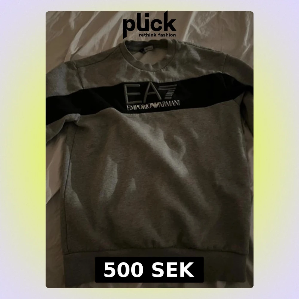 Säljer en stilren grå sweatshirt från Emporio Armani EA7 med svart panel och logga över bröstet. Tröjan har rund halsringning och långa ärmar. Perfekt för dig som gillar klassiska streetwear-vibbar.