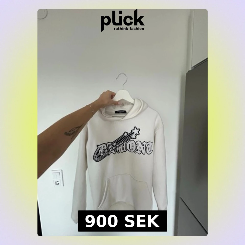Säljer en vit hoodie från Demont! Perfekt för dig som gillar streetwear och vill ha en skön och stilren look. Finns en liten fläck upptill.