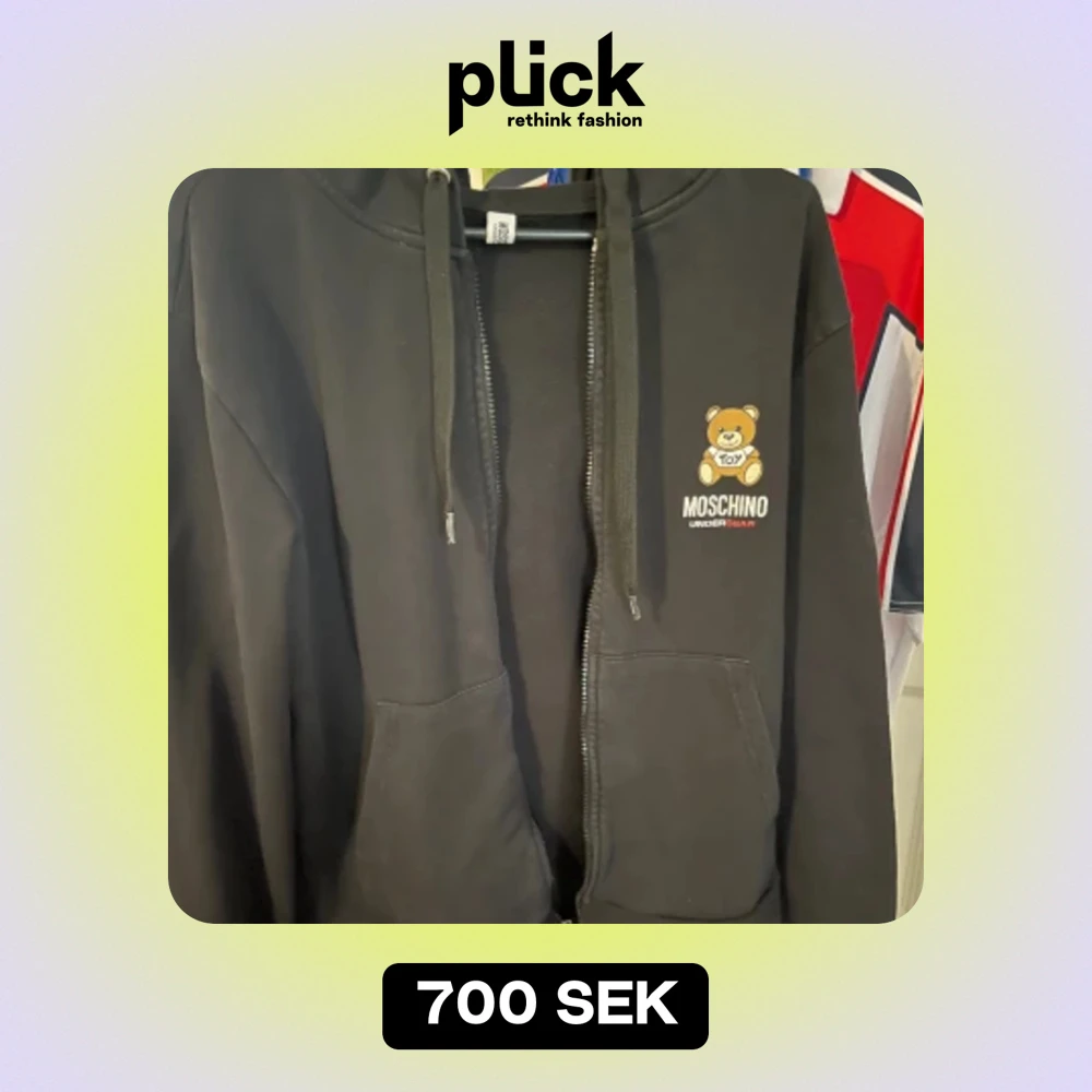 Det är en Moschino zip tröja Den har använts en del men är i ett bra skick 7/10 den är helt äkta köpt från Zalando för ett år sedan nypris för varan är 2500 och jag säljer den för ca 1/4 av priset. Helst mötas upp.