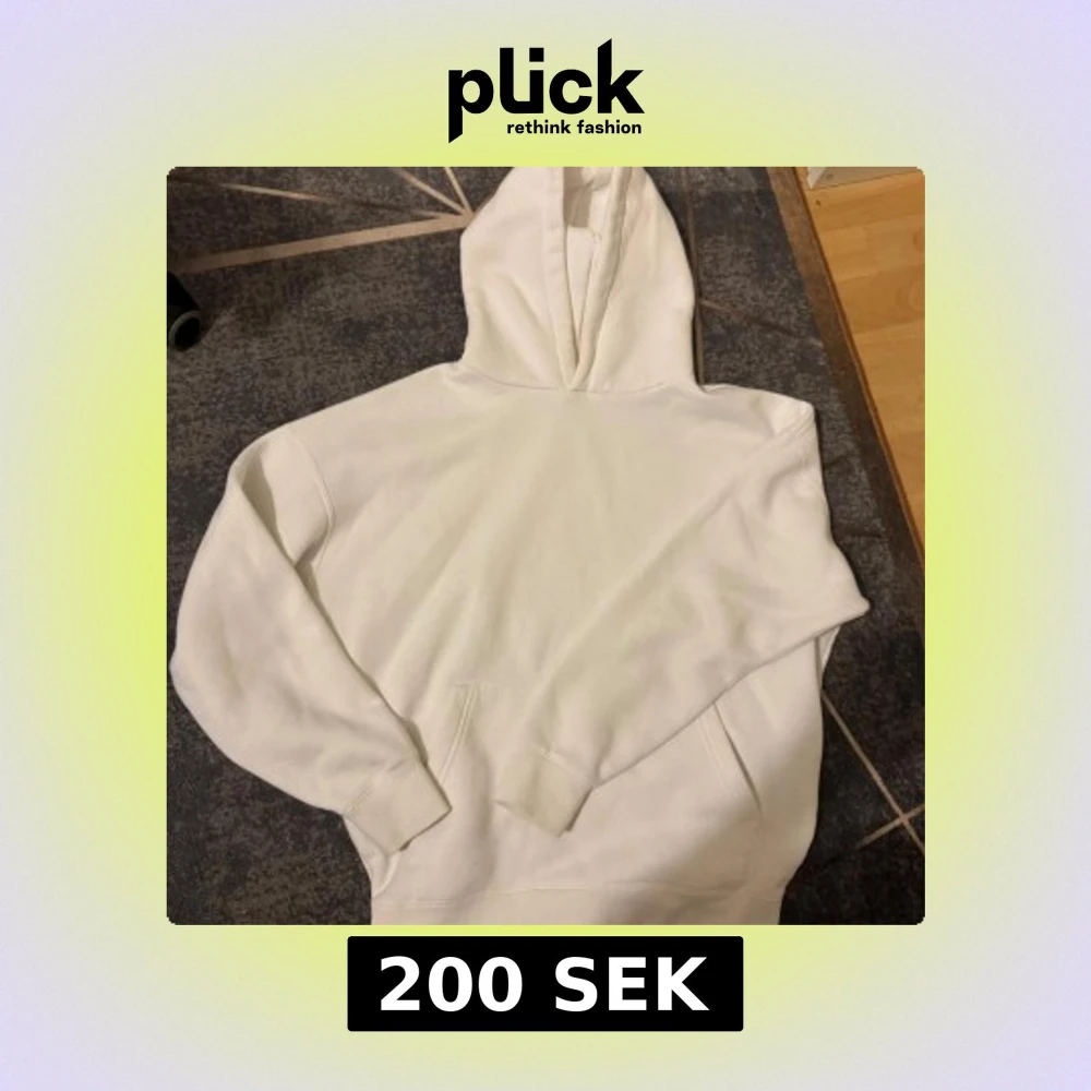 Säljer en stilren vit hoodie med huva och stor magficka. Tröjan har långa ärmar, ribbade muddar och är tillverkad i mjukt bomullsmaterial. Perfekt för dig som gillar en clean och enkel look.