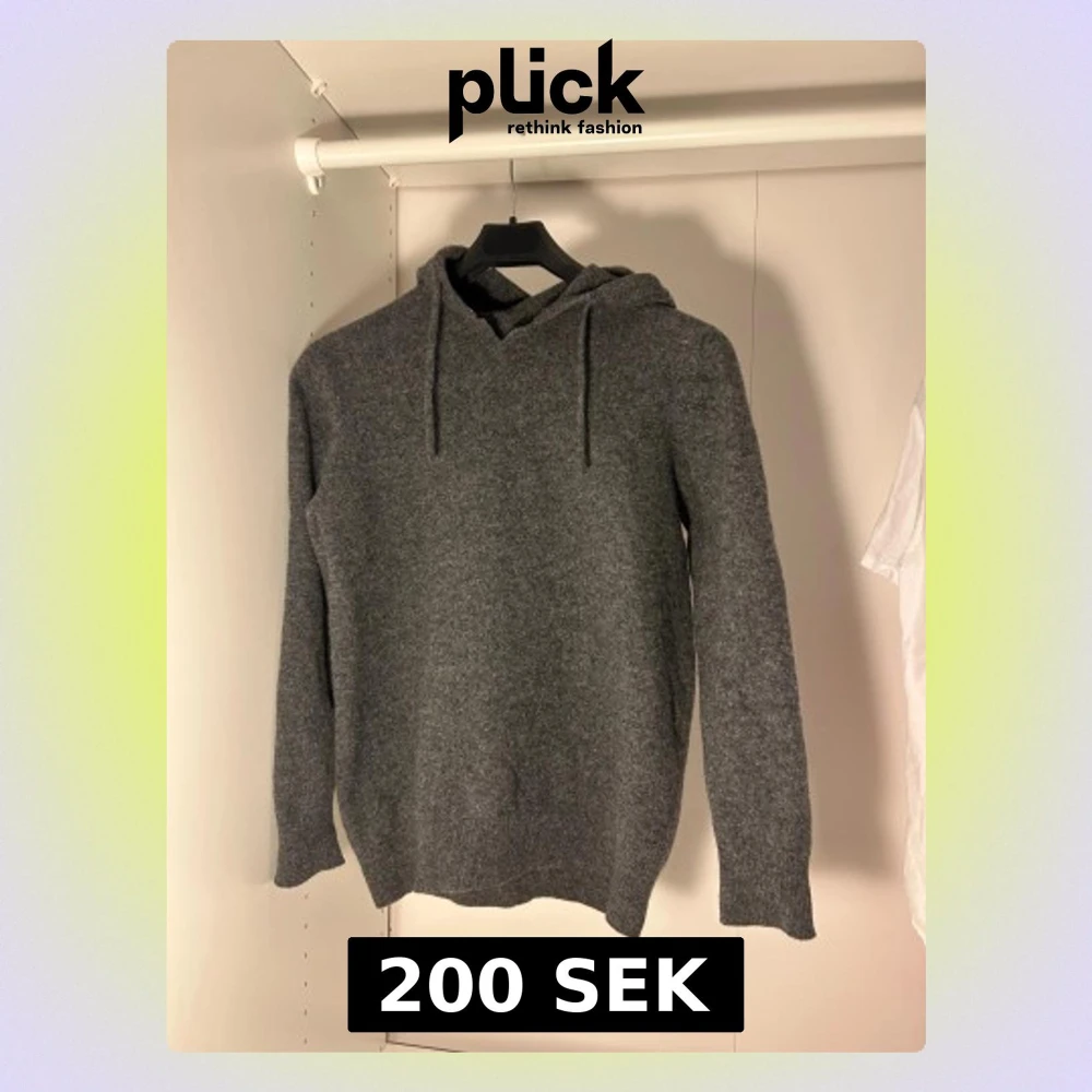 Mysig grå hoodie i kashmir med huva och snörning. Perfekt för kyliga dagar och har en enkel, clean look som funkar till jeans eller mjukisbyxor. Storlek Smen passar även XS. Defekter finns