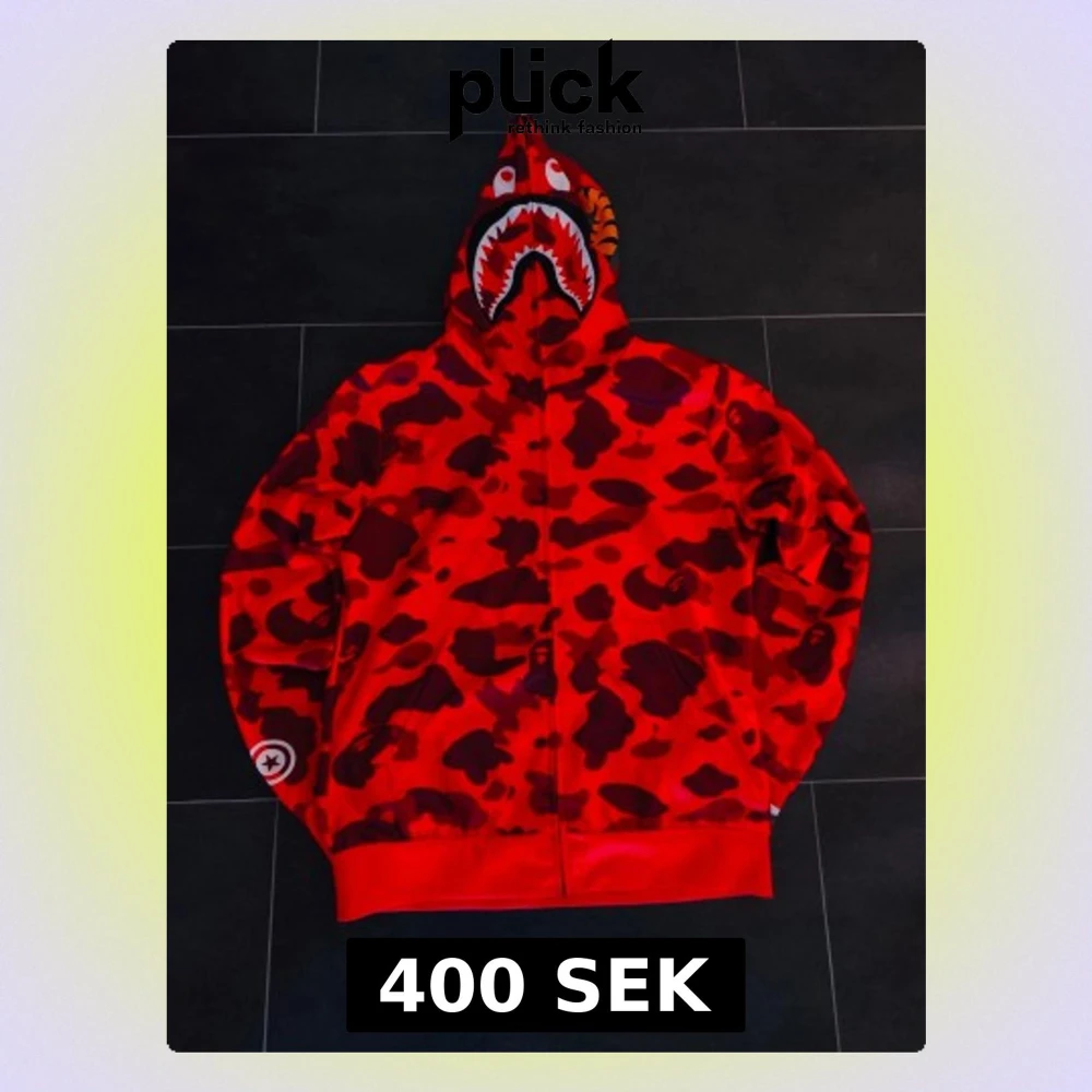 Säljer en röd BAPE Shark Hoodie med ikoniskt camomönster och hajmotiv på huvan. Dragkedja framtill och detaljerad logga på ärmen. Perfekt för dig som vill sticka ut med streetwear från A Bathing Ape. Materialet är mjukt och bekvämt, troligen bomullsblandning.