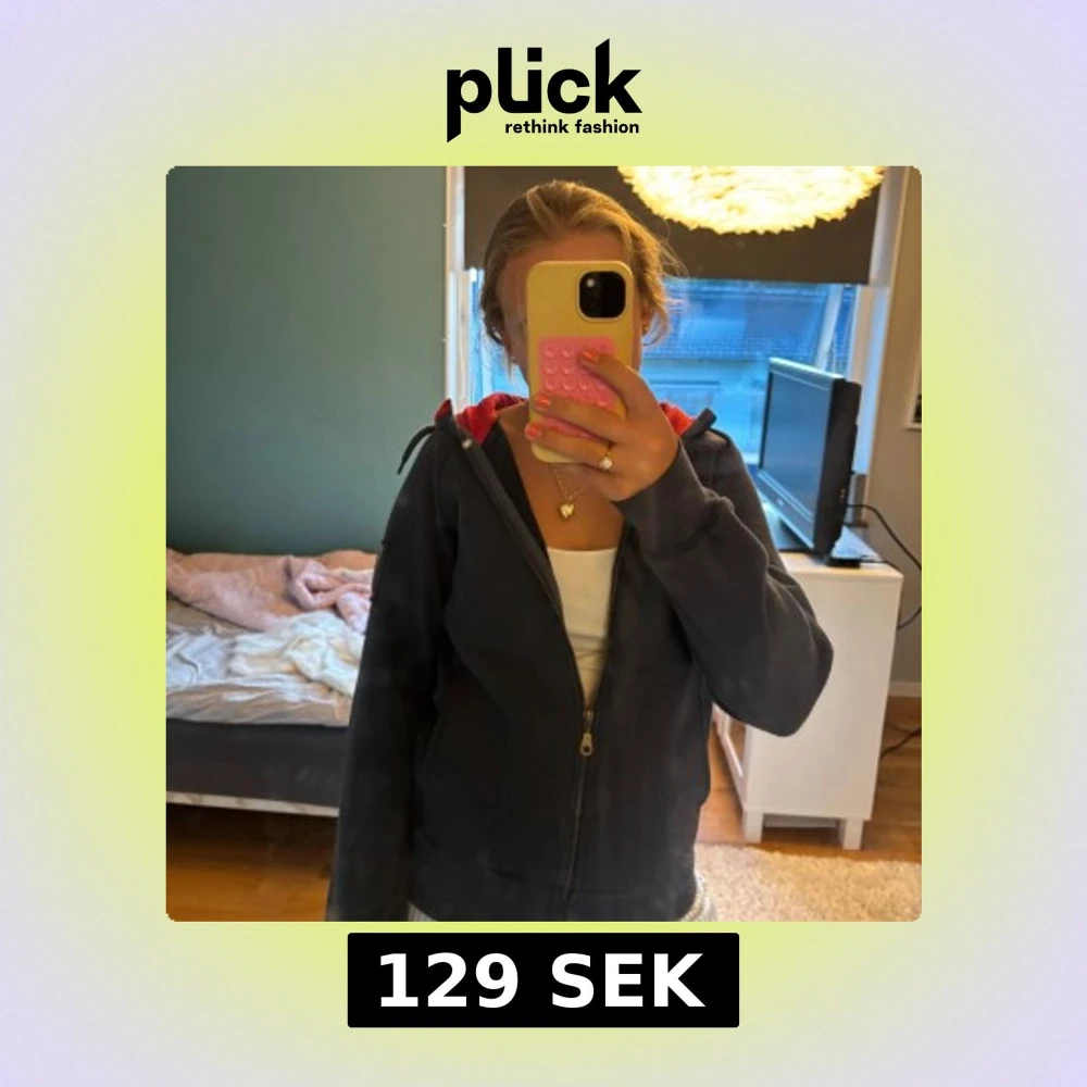 Svart hoodiejacka med dragkedja och röd insida på huvan. Jackan har långa ärmar, ficka på ärmen och en avslappnad passform. Perfekt för chill dagar eller när du vill ha något bekvämt och snyggt.