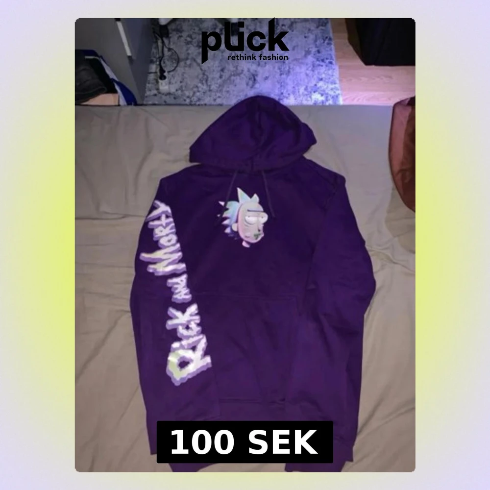 Säljer en lila hoodie med Rick and Morty-tryck på bröstet, ryggen och ärmen. Hoodien har en stor huva och coola grafiska motiv från serien. Perfekt för dig som älskar animerade serier och vill sticka ut med en färgstark stil.