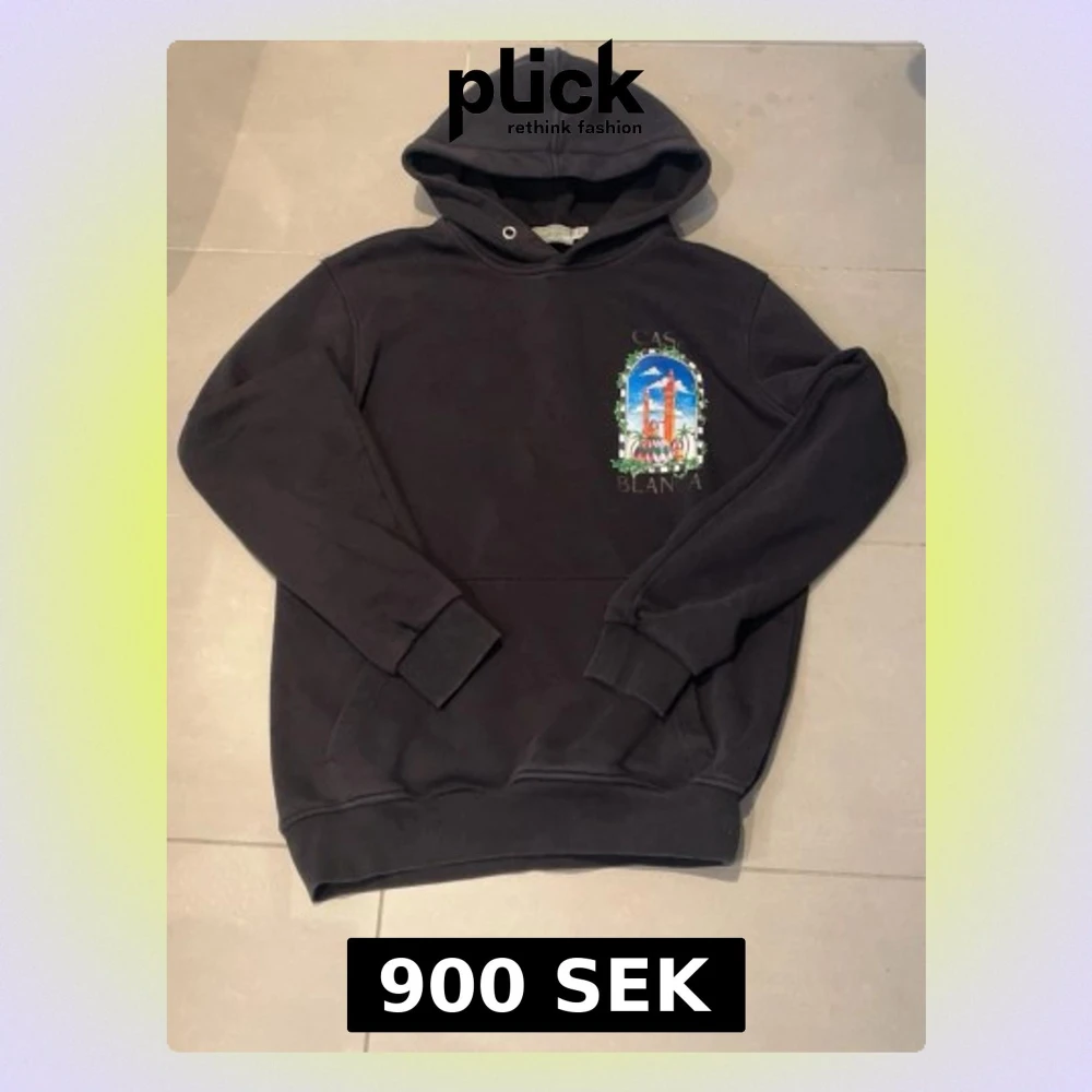 Svart hoodie från Casablanca med stor färgglad grafik av torn och palmer på ryggen samt mindre tryck på bröstet. Klassisk huva med dragsko och ribbade muddar. Perfekt för dig som gillar streetwear och vill sticka ut med snygg design.