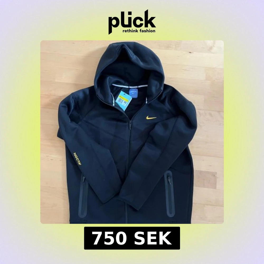 Svart hoodie från Nike NOCTA med gul logga på bröstet och NOCTA-tryck på ärmen. Tröjan har huva, hel dragkedja och två fickor med dragkedja. Materialet är mjukt och känns som polyester. Snygga detaljer med broderade bokstäver på ryggen och ärmen.