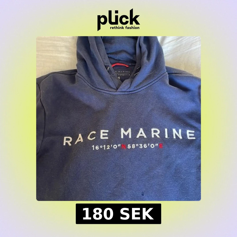 Säljer en snygg mörkblå hoodie från Race Marine med tryck på framsidan. Perfekt för en avslappnad stil. Den har en klassisk passform och är tillverkad i ett mjukt material för extra komfort.