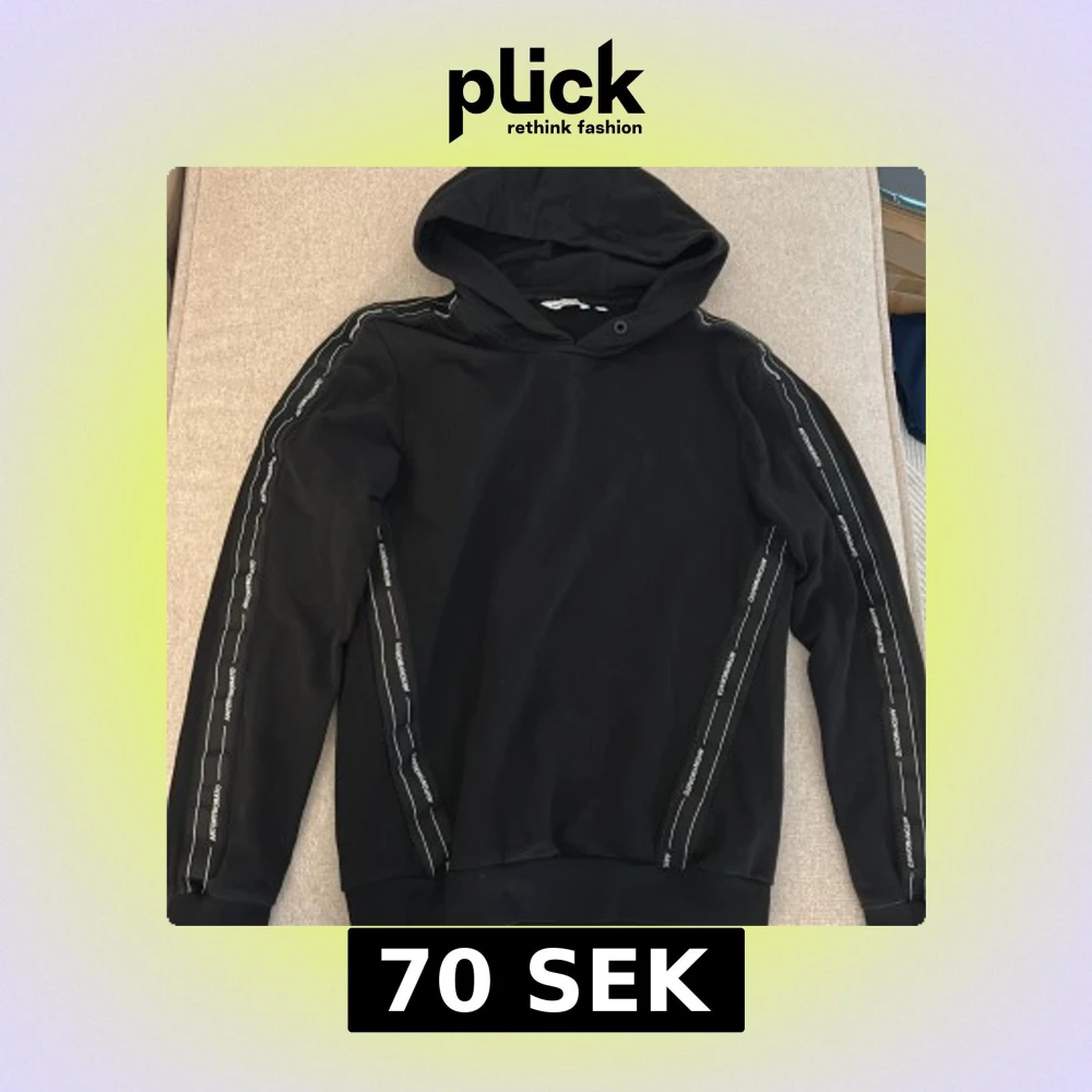 Svart hoodie från Antony Morato i storlek S med huva och långa ärmar. Snygga vita logoremsor längs ärmarna ger en sportig vibe. Tröjan har ribbade muddar och är tillverkad i mjuk bomullsmix som är skön att bära. Perfekt för chill eller streetwear.