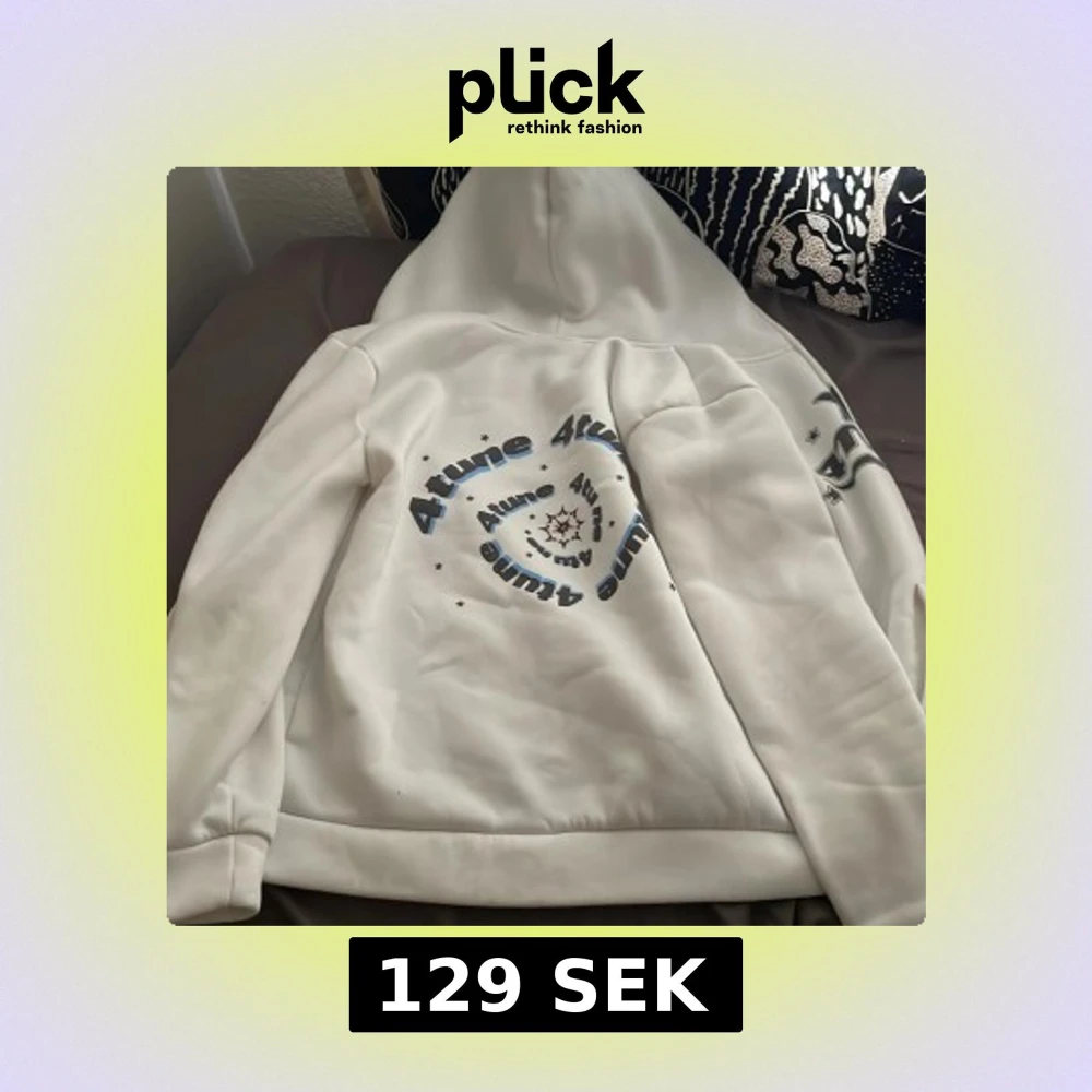 Säljer en vit hoodie från 4tune med svart och blått tryck både fram och bak. Tröjan har huva, dragkedja och coola stjärndetaljer. Perfekt för dig som gillar streetwear och vill sticka ut med snygg grafik.