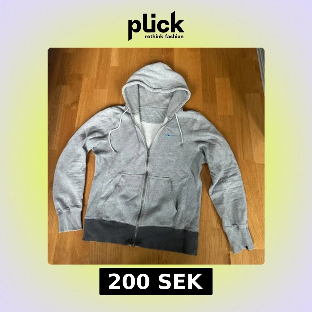 Säljer en grå hoodie från Nike med dragkedja och blå logga på bröstet. Tröjan har en justerbar huva med snören och är tillverkad i mjukt material för extra komfort. Perfekt för kyliga dagar. S/xs är storleken