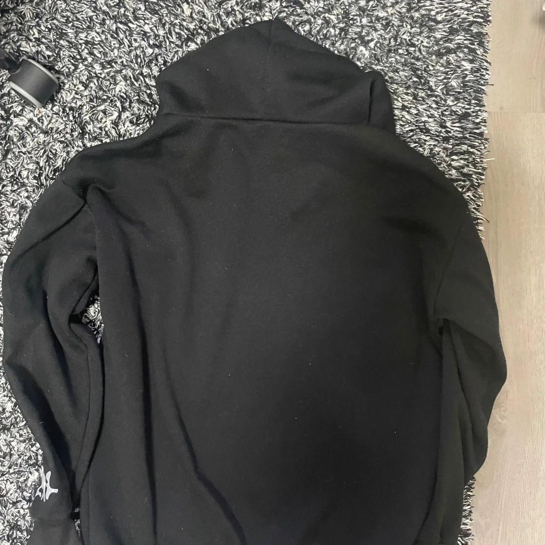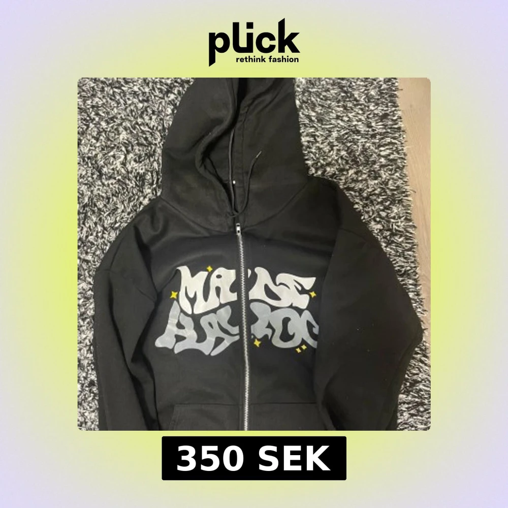Säljer en svart hoodie med coolt tryck i grått och små gula detaljer. Den har en dragkedja framtill och en stor huva. Perfekt för en avslappnad stil.
