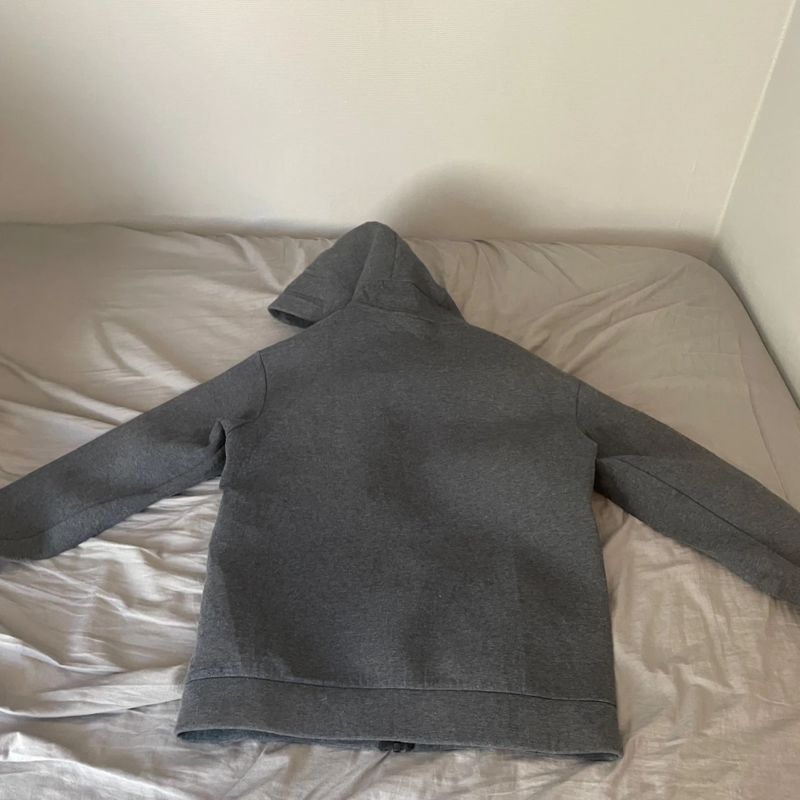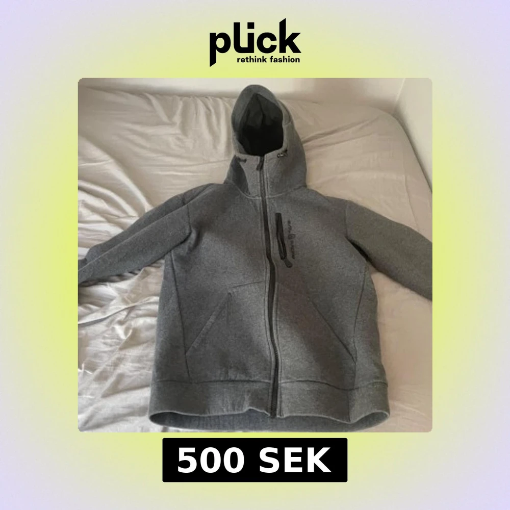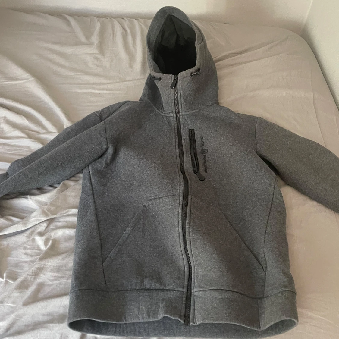 Säljer en grå hoodiejacka från Sailracing med hel dragkedja och praktisk bröstficka med zip. Jackan har en stor huva och är tillverkad i mjukt polyester-material, perfekt för chill eller utomhusaktiviteter. Snygg och enkel design med lång ärm och normal passform.