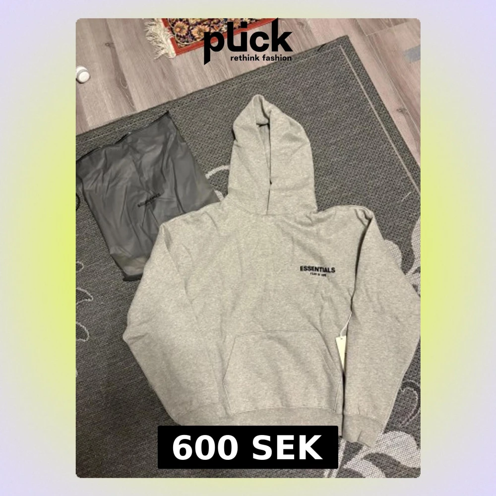 Snygg grå hoodie från Essentials Fear of God med svart logotyp på bröstet och ryggen. Tröjan har huva, känguruficka och ribbade muddar. Mjuk insida och klassisk loose passform, perfekt för chill dagar. Kommer med originalpåse och tag.