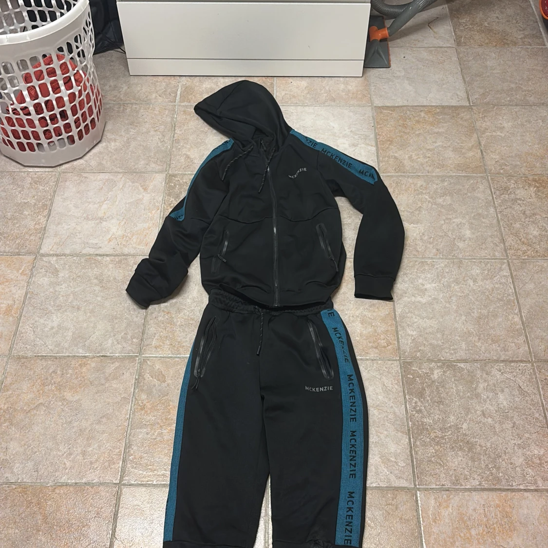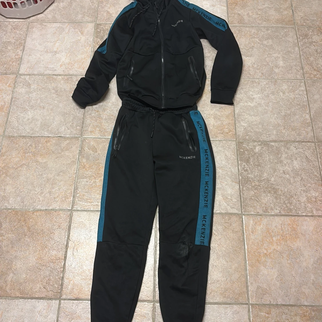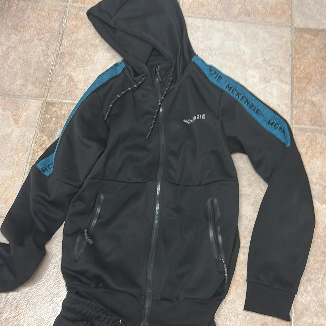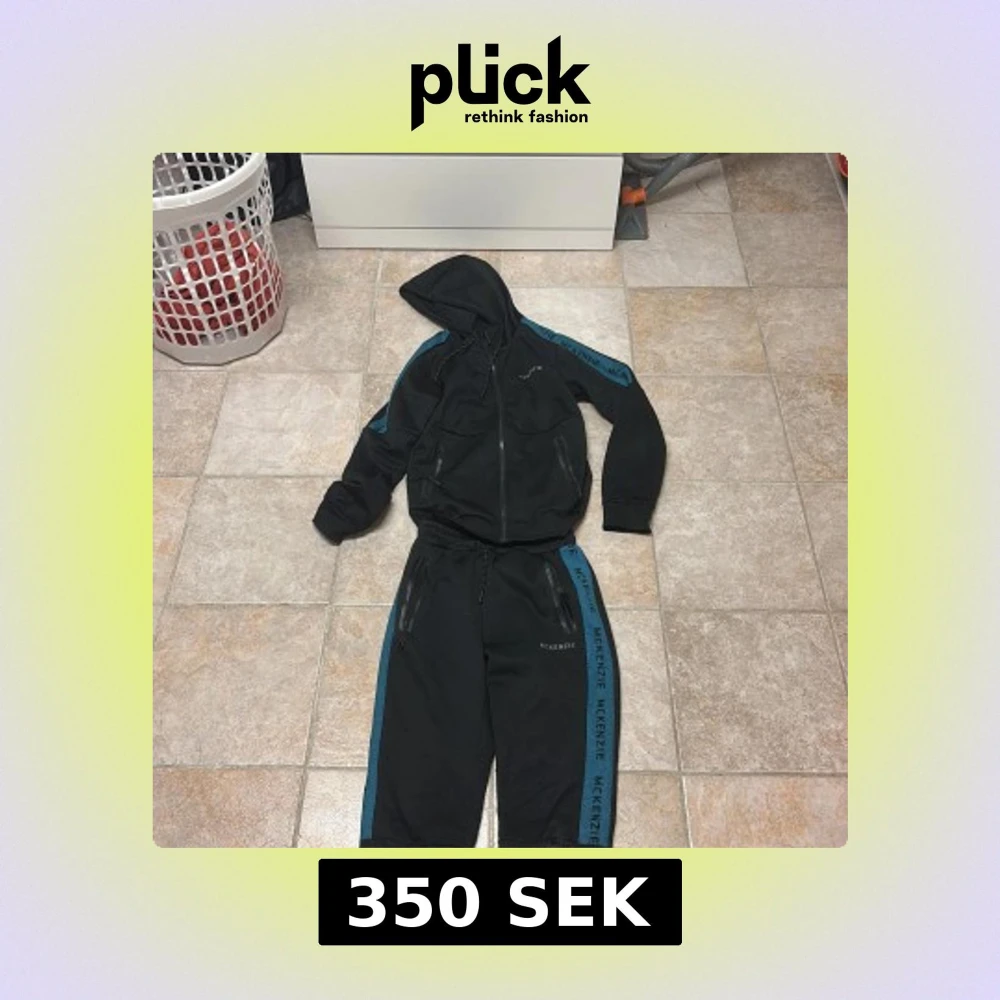 Svarta mjukisbyxor från McKenzie med blå sidopaneler och logga längs benen. Byxorna har resår i midjan, snörning och dragkedjeförsedda fickor. Materialet är mjukt och stretchigt, perfekt för chill eller träning.