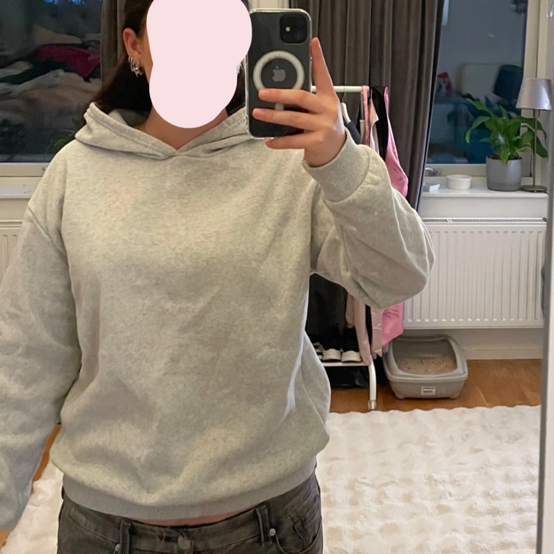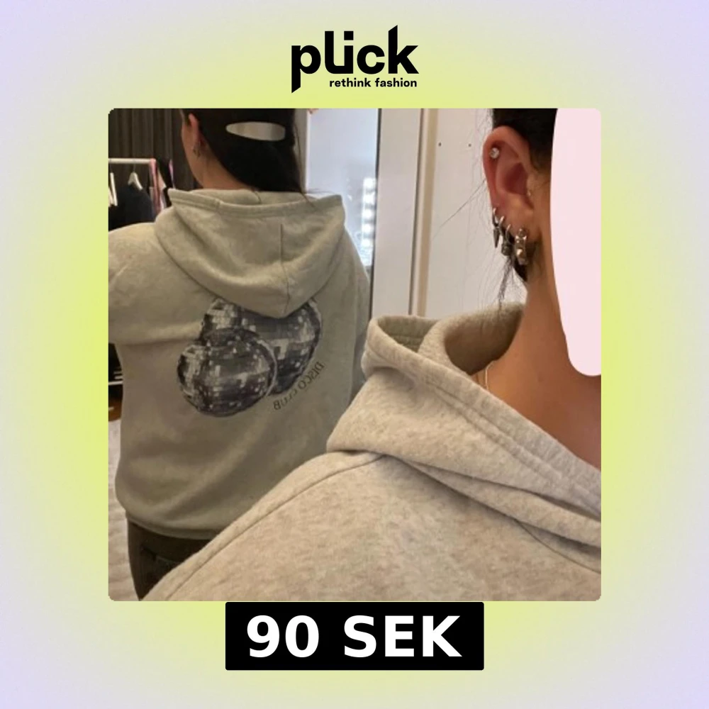 Säljer en ljusgrå hoodie med tryck av två discokulor på ryggen. Lite nopprig💗