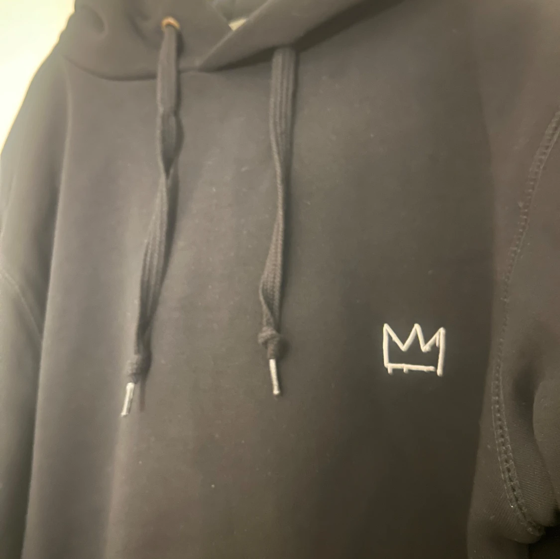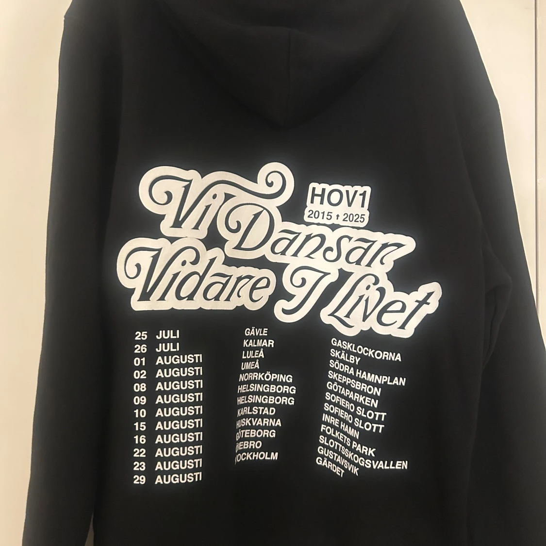 Svart hoodie från Hov1 2025 tour, med broderad krona framtill och stort vitt turnétryck på ryggen. Perfekt för dig som älskar hov1! Säljer då den inte kommer till användning, och de finns inga fler till salu så köp!