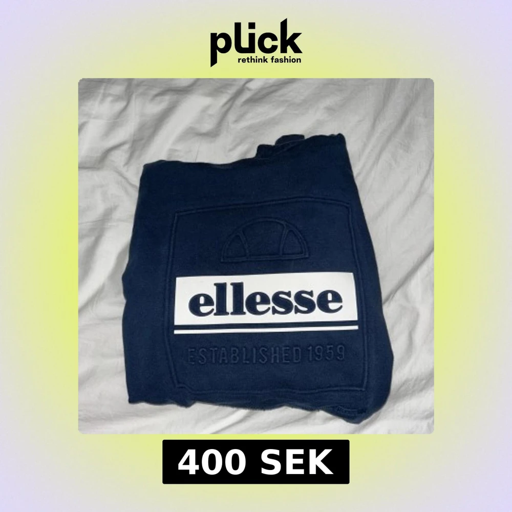 Snygg mörkblå hoodie från Ellesse med stor vit logga och texten 'Established 1959' på bröstet. Tröjan har huva med vita snören och klassisk känguruficka framtill. Perfekt för dig som gillar streetwear och sportig stil.