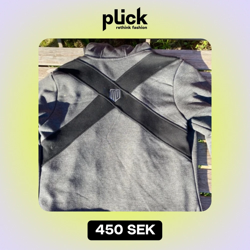 Säljer en snygg grå hoodie från Maya Delorez. Den har en dragkedja framtill och coola svarta detaljer i form av korsade band på ryggen. Perfekt för höst och vår, med långa ärmar och en bekväm passform. Märkesloggan syns både fram och bak. Perfekt för en casual look eller träning!