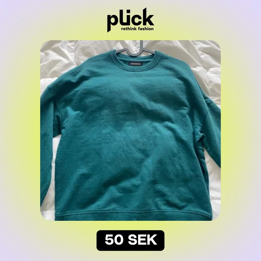 En grön tjocktröja. Har ett litet hål i ena armen som man kan se på bilden, men annars inga större fel. Vet inte storleken, men tror det är S