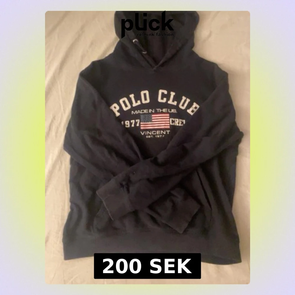 Mörkblå hoodie från Polo Club med vit text och amerikansk flagga på bröstet. Klassisk huva med dragsko och ribbade muddar vid ärmar och nederkant. Perfekt för en avslappnad och sportig stil.