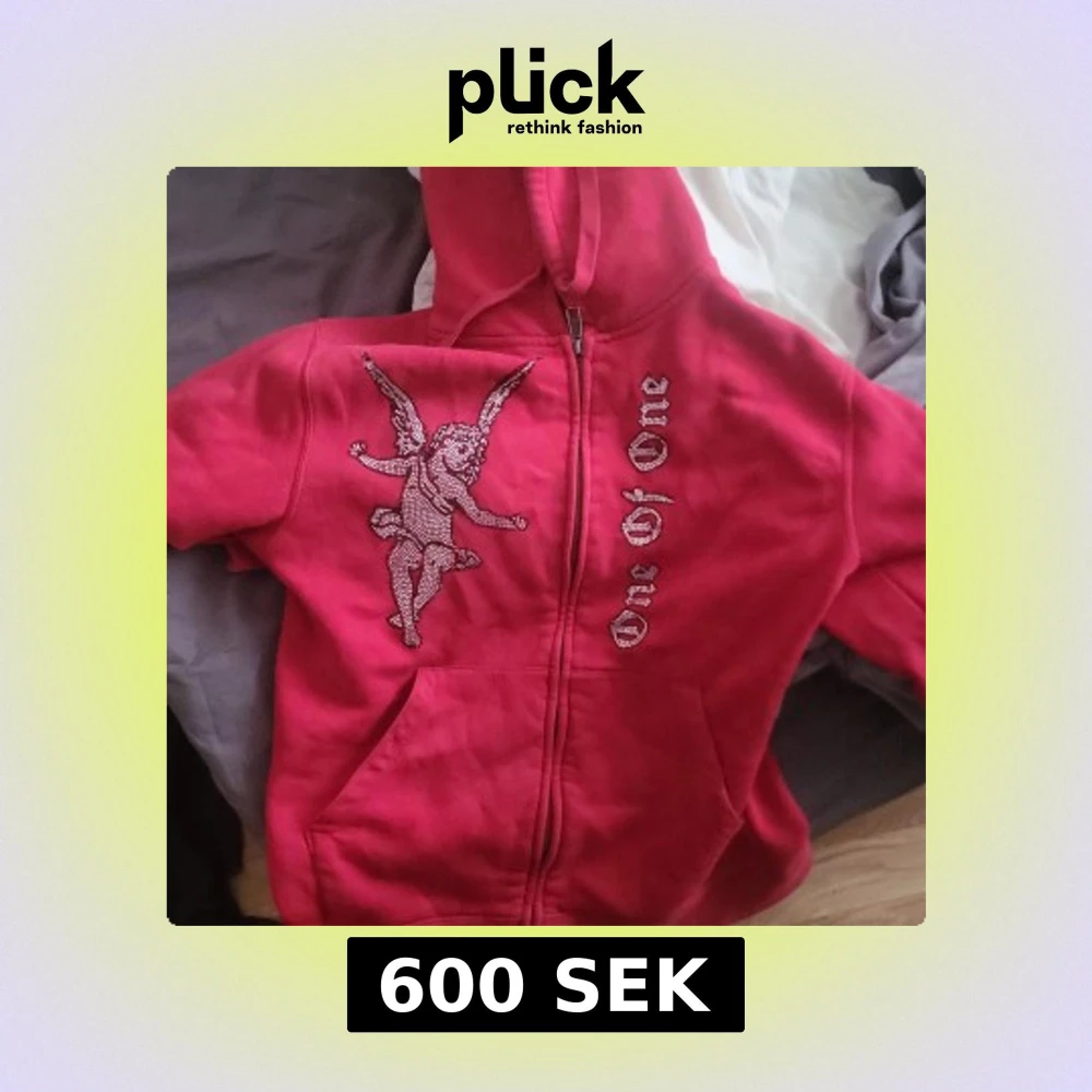 Säljer en röd hoodie från One of One med dragkedja. På framsidan finns ett stort ängelmotiv och texten 'One of One' i glittriga stenar. Hoodien har fickor och huva, perfekt för en cool streetstyle-look.