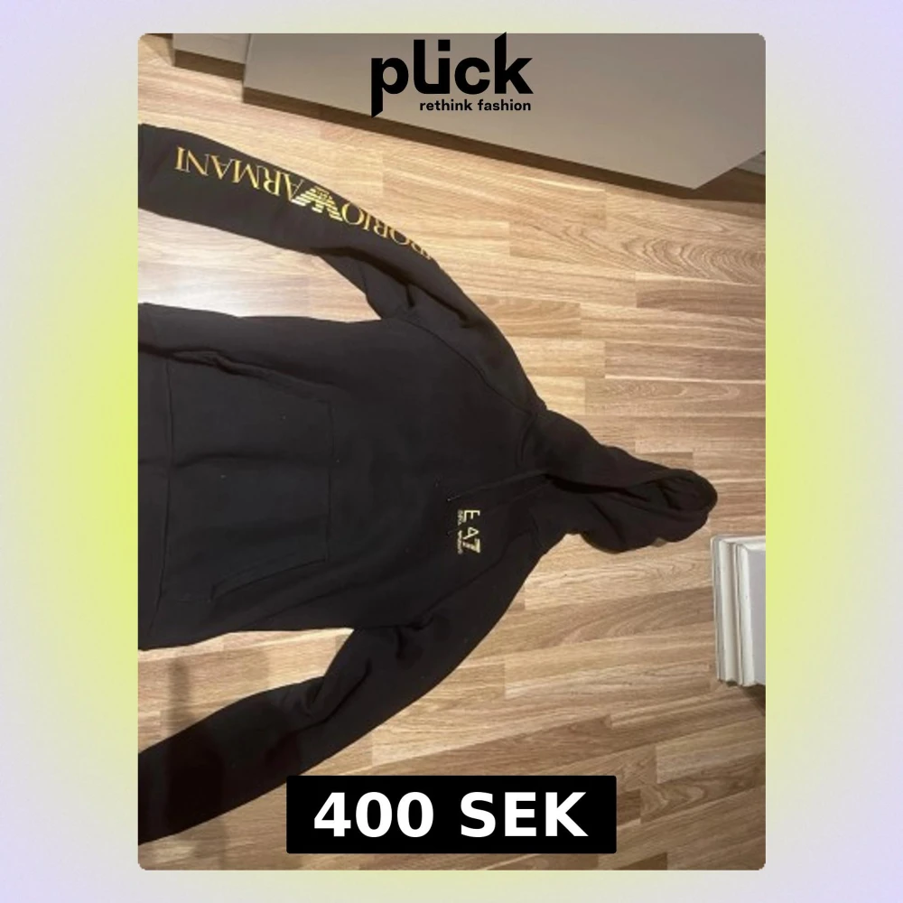 Snygg svart hoodie från Emporio Armani med guldfärgat EA7-tryck på bröstet och stort Emporio Armani-tryck längs ena ärmen. Klassisk känguruficka framtill och justerbar huva med snören. Perfekt för dig som gillar exklusiv streetwear.