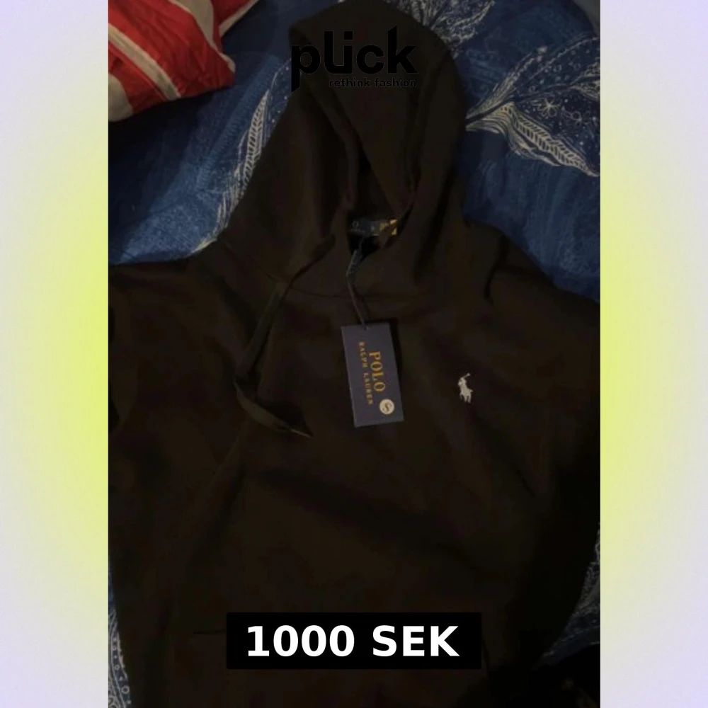 Det är en svart huvtröja från Polo Ralph Lauren. På bröstet finns det klassiska lilla broderade logotypsmotivet med en ryttare och häst i vitt. Huvan har svarta dragsnören och framtill sitter en mörk, rektangulär prislapp med guldtext där det står POLO RALPH LAUREN samt storleken “S”. Huvtröjan ligger utlagd på ett blått täcke med vita mönster. Den ser ny och oanvänd ut med taggen fortfarande kvar.