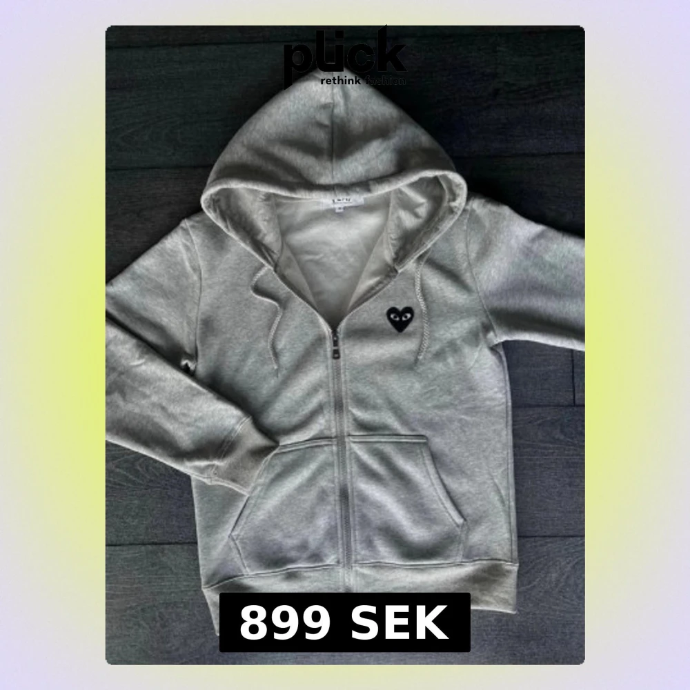 Grå zip-hoodie med ikoniskt hjärtmotiv. Tröjan har dragkedja framtill, huva med snörning samt fickor. Litet hjärta på bröstet och större hjärta med ögon på ryggen. Klassisk passform och mjukt material, perfekt till vardags.