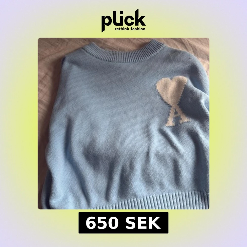 Säljer en ljusblå stickad tröja från Ami Paris med deras ikoniska hjärta och A-logga i vitt på bröstet. Tröjan har rund halsringning och ribbade muddar. Perfekt för dig som gillar stilrena och trendiga plagg.