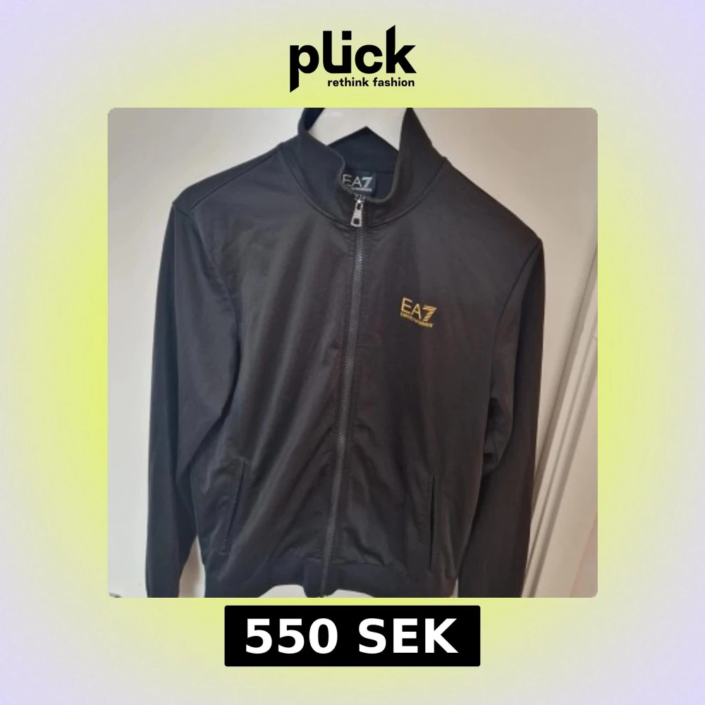Svart tracksuit från EA7 Emporio Armani med guld logga på bröstet och snygga guldfärgade detaljer på ryggen. Jackan har dragkedja framtill, ståkrage och två sidofickor. Perfekt för dig som gillar stilren och sportig design. Dessutom får du med de stiliga byxorna med loggan på baksidan av byxorna