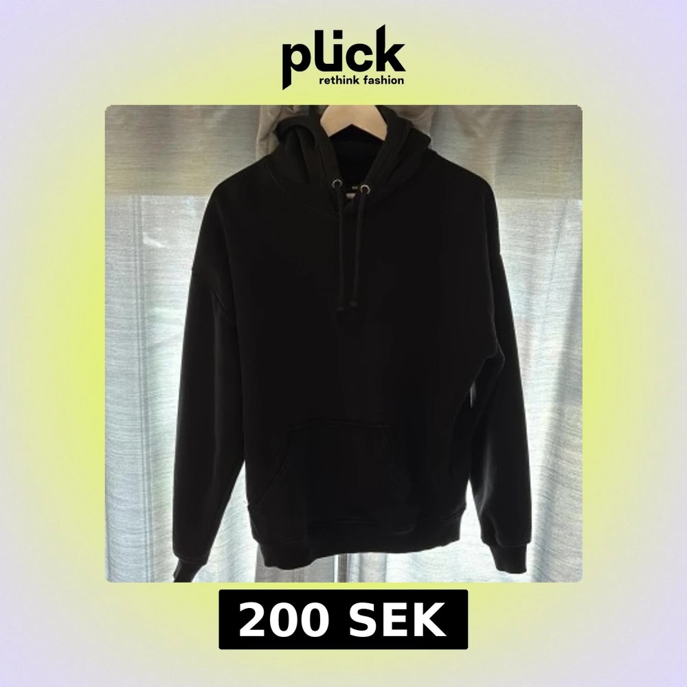 Säljer en klassisk svart hoodie med känguruficka. Perfekt för en avslappnad stil. Den har långa ärmar och ribbade muddar vid ärmslut och nederkant.