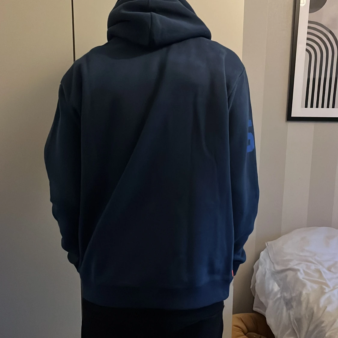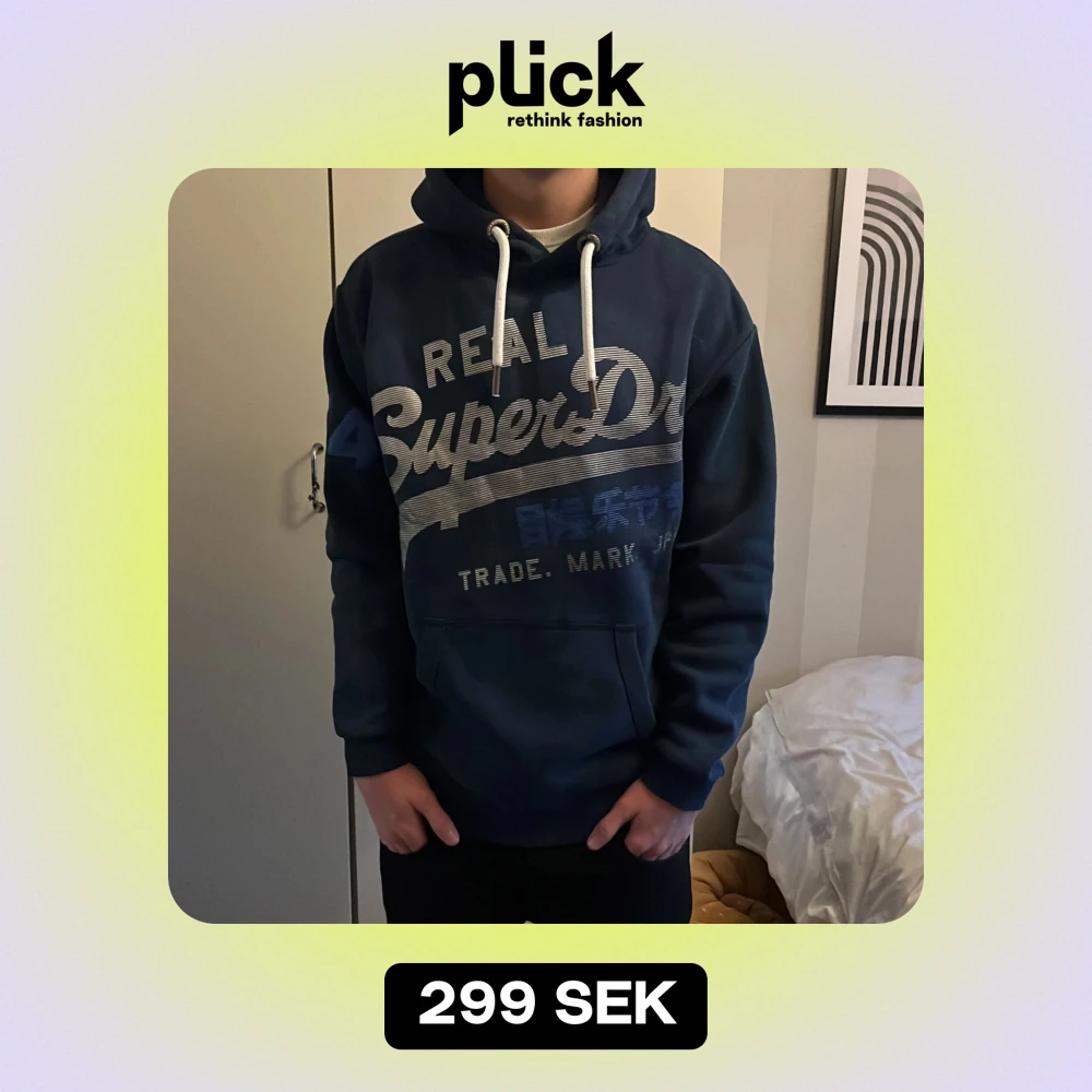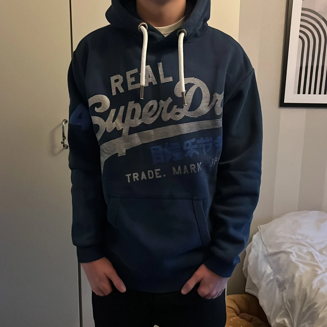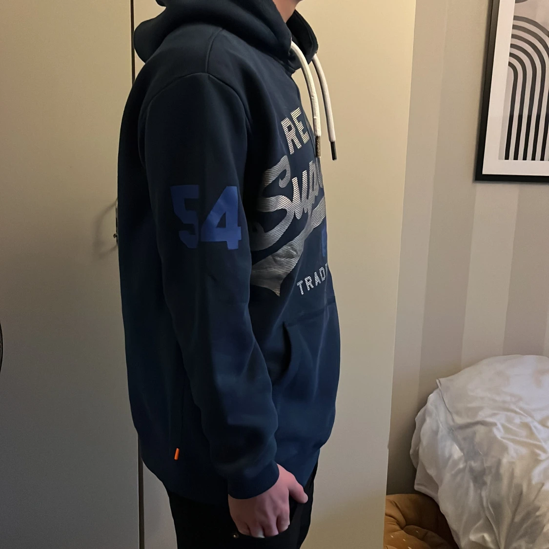 Säljer en fet blå hoodie från Superdry i bra skick. Den har en stor logga på framsidan och siffran 54 på ärmen. Perfekt för höst och vinter. Huvan har vita snören vilket gör en snygg look. Storleken är S är men passformen är den större.