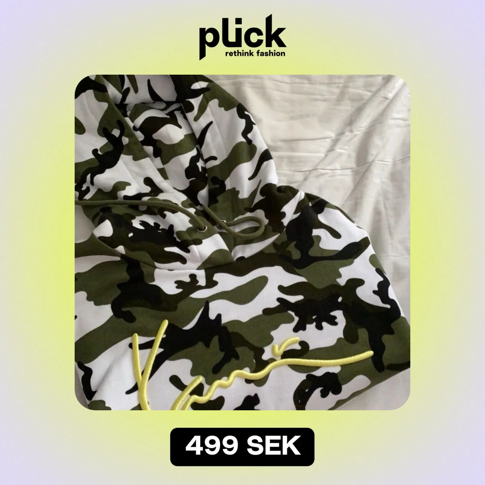Säljer en cool hoodie i camouflage-mönster med en snygg gul broderad text på framsidan. Den har en bekväm passform med långa ärmar och en praktisk huva. Perfekt för en avslappnad stil eller streetwear-look! Helt ny skick, knappt använd.