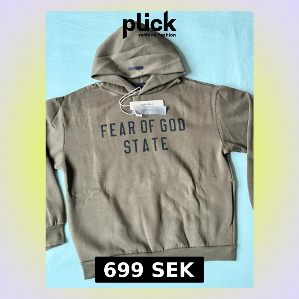 Snygg olivgrön hoodie från Fear of God Essentials med texten 'FEAR OF GOD STATE' på bröstet. Hoodien har huva med dragsko och ribbade muddar. Perfekt för dig som vill ha en trendig och bekväm look. Materialet är mjukt och känns lyxigt.