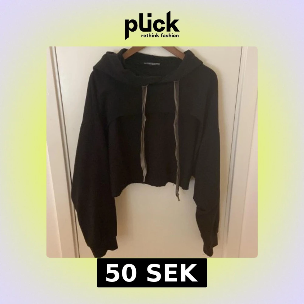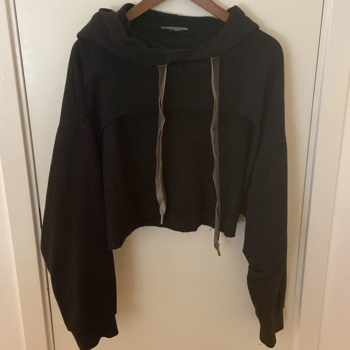 Svart croppad hoodie med långa ärmar och bred huva. Tröjan har coola snören framtill och en loose passform som ger en avslappnad vibe. Perfekt för dig som gillar streetstyle och vill ha något bekvämt men trendigt.
