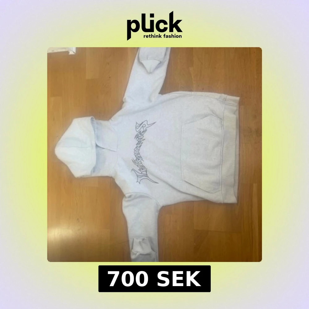 Säljer en grå hoodie från Vetements med tryck på bröstet och ryggen. Hoodien har en klassisk passform med en stor ficka framtill och en bekväm huva. Perfekt för en avslappnad stil.