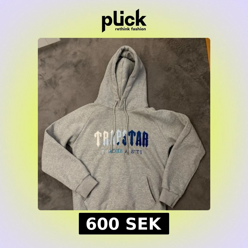 Snygg grå hoodie från Trapstar med stor huva och snörning. Framsidan har Trapstar-logga i olika blå nyanser och vitt. Mjuk bomullskänsla, ribbade muddar och klassisk passform. Perfekt för dig som gillar streetwear och vill sticka ut lite extra. Använd fåtal ggr och i väldigt bra skick!!