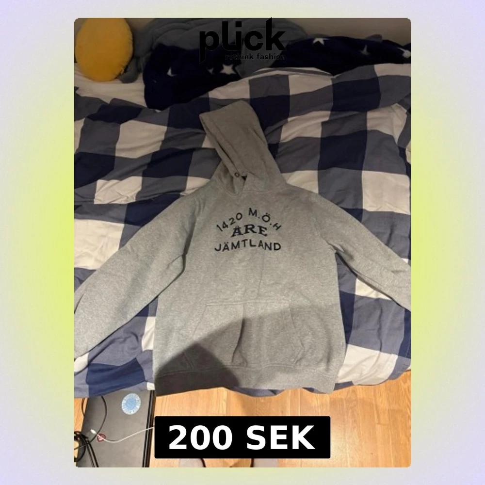 Säljer en grå hoodie med svart tryck på bröstet där det står '1420 M.Ö.H ÅRE JÄMTLAND'. Klassisk modell med huva och magficka. Perfekt för chill dagar eller exkursioner. I mjukt deminspirerat material och enkel design utan synligt märke.