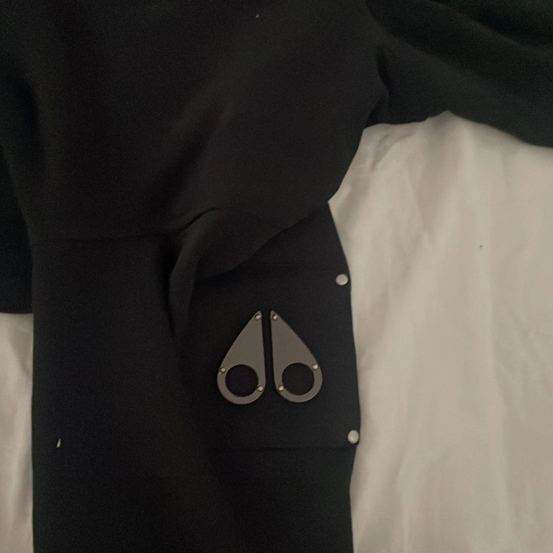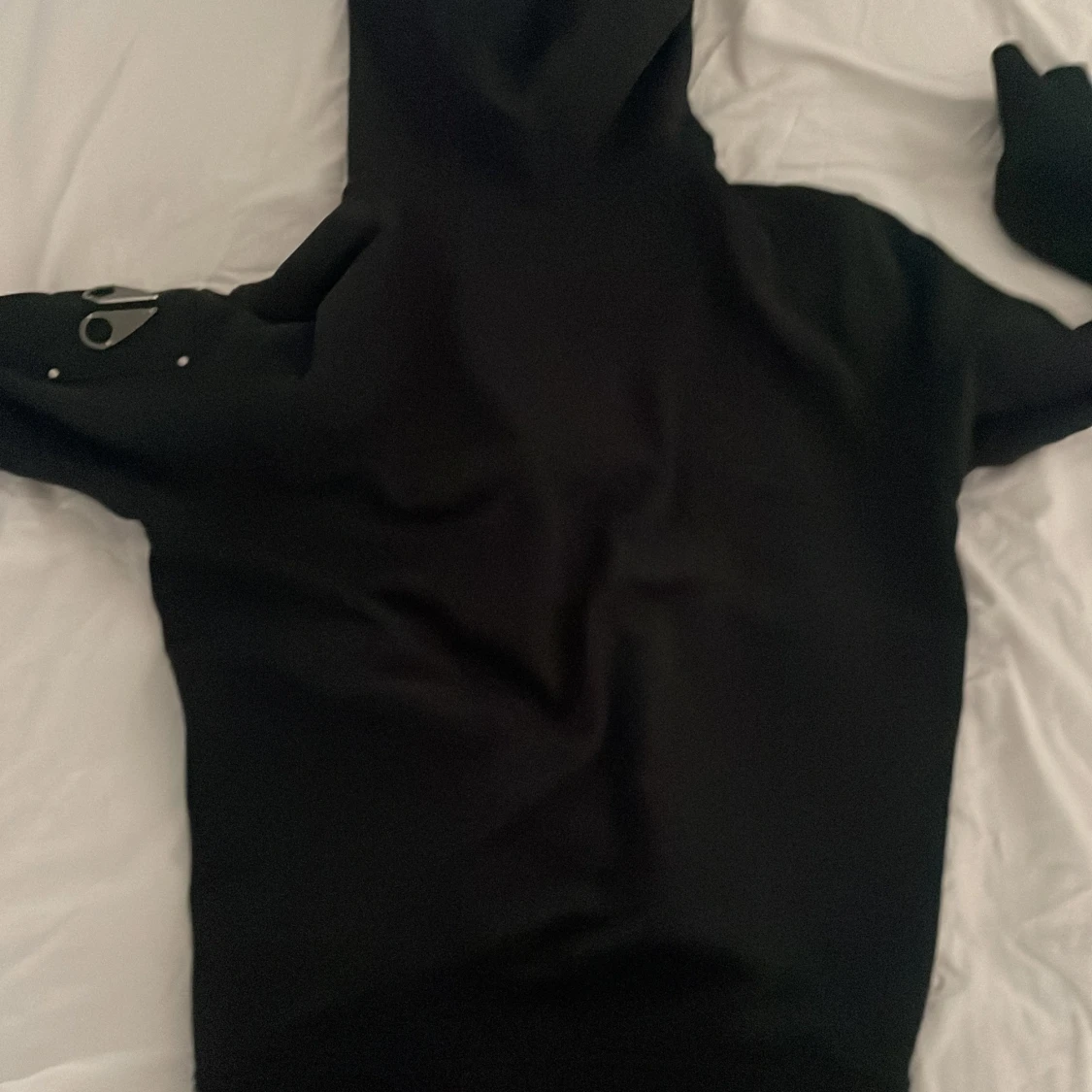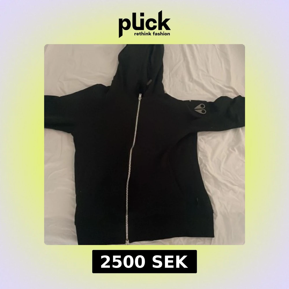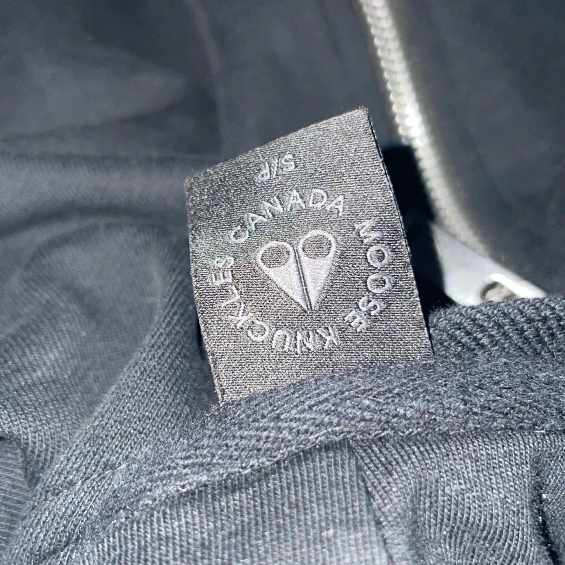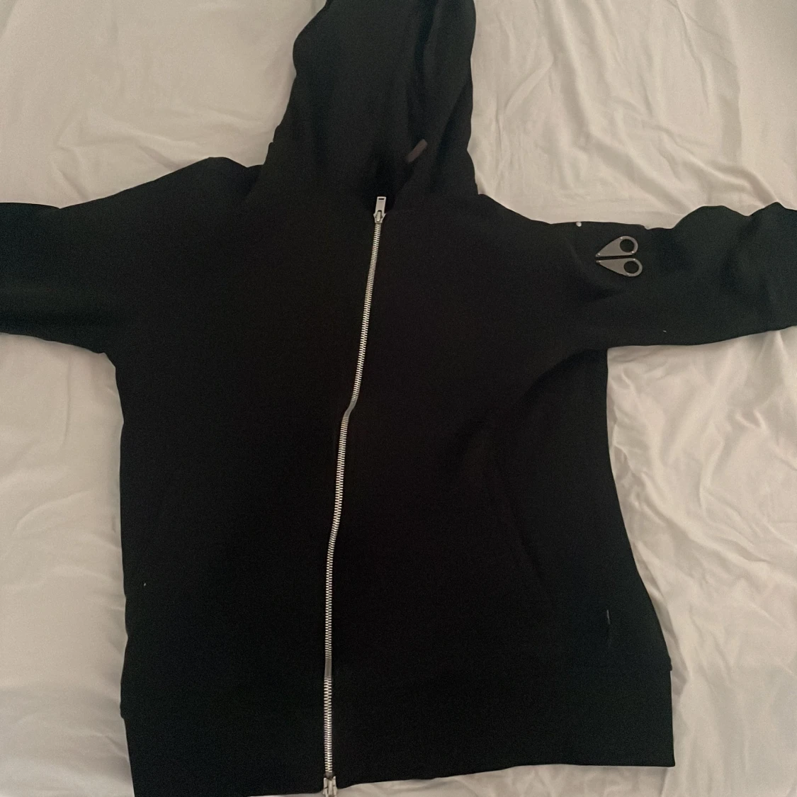 Svart hoodie från Moose Knuckles med silverfärgad dragkedja och ikonisk logga i metall på ärmen. Tröjan har huva och långa ärmar, perfekt för en chill och stilren look. Tillverkad i mjuk bomullsmix som känns skön mot huden. Finns en pytteliten skavank som knapps syns. Nypris 3200.