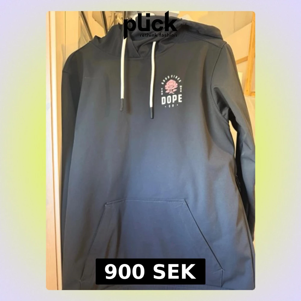 Svart hoodie/slalomjacka från Dope med vit dragsko i huvan och ett litet tryck på bröstet med texten 'Good Vibes' och en rosa blomma. Hoodien har en stor magficka och mjukt fleecefoder på insidan. Perfekt för chill dagar och streetwear-stil. Använd 1 gång